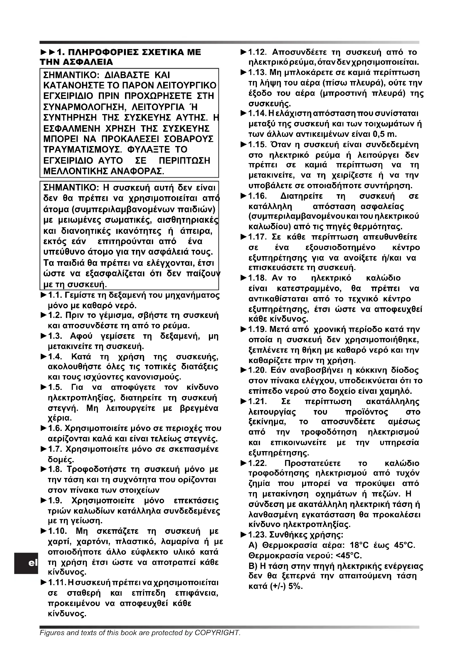 пунктом дистриб’ютораel ►►1. ΠΛΗΡΟΦΟΡΙΕΣ ΣΧΕΤΙΚΑ ΜΕ ΤΗΝ ΑΣΦΑΛΕΙΑ ΣΗΜΑΝΤΙΚΟ: ΔΙΑΒΑΣΤΕ ΚΑΙ ΚΑΤΑΝΟΗΣΤΕ ΤΟ ΠΑΡΟΝ ΛΕΙΤΟΥΡΓΙΚΟ ΕΓΧΕΙΡΙΔΙΟ ΠΡΙΝ ΠΡΟΧΩΡΗΣΕΤΕ ΣΤΗ ΣΥΝΑΡΜΟΛΟΓΗΣΗ, ΛΕΙΤΟΥΡΓΙΑ Ή ΣΥΝΤΗΡΗΣΗ ΤΗΣ ΣΥΣΚΕΥΗΣ ΑΥΤΗΣ. Η ΕΣΦΑΛΜΕΝΗ ΧΡΗΣΗ ΤΗΣ ΣΥΣΚΕΥΗΣ ΜΠΟΡΕΙ ΝΑ ΠΡΟΚΑΛΕΣΕΙ ΣΟΒΑΡΟΥΣ ΤΡΑΥΜΑΤΙΣΜΟΥΣ. ΦΥΛΑΞΤΕ ΤΟ ΕΓΧΕΙΡΙΔΙΟ ΑΥΤΟ ΣΕ ΠΕΡΙΠΤΩΣΗ ΜΕΛΛΟΝΤΙΚΗΣ ΑΝΑΦΟΡΑΣ. ΣΗΜΑΝΤΙΚΟ: Η συσκευή αυτή δεν είναι δεν θα πρέπει να χρησιμοποιείται από άτομα (συμπεριλαμβανομένων παιδιών) με μειωμένες σωματικές, αισθητηριακές και διανοητικές ικανότητες ή άπειρα, εκτός εάν επιτηρούνται από ένα υπεύθυνο άτομο για την ασφάλειά τους. Τα παιδιά θα πρέπει να ελέγχονται, έτσι ώστε να εξασφαλίζεται ότι δεν παίζουν με τη συσκευή. ►1.1. Γεμίστε τη δεξαμενή του μηχανήματος μόνο με καθαρό νερό. ►1.2. Πριν το γέμισμα, σβήστε τη συσκευή και αποσυνδέστε τη από το ρεύμα. ►1.3. Αφού γεμίσετε τη δεξαμενή, μη μετακινείτε τη συσκευή. ►1.4. Κατά τη χρήση της συσκευής, ακολουθήστε όλες τις τοπικές διατάξεις και τους ισχύοντες κανονισμούς. ►1.5. Για να αποφύγετε τον κίνδυνο ηλεκτροπληξίας, διατηρείτε τη συσκευή στεγνή. Μη λειτουργείτε με βρεγμένα