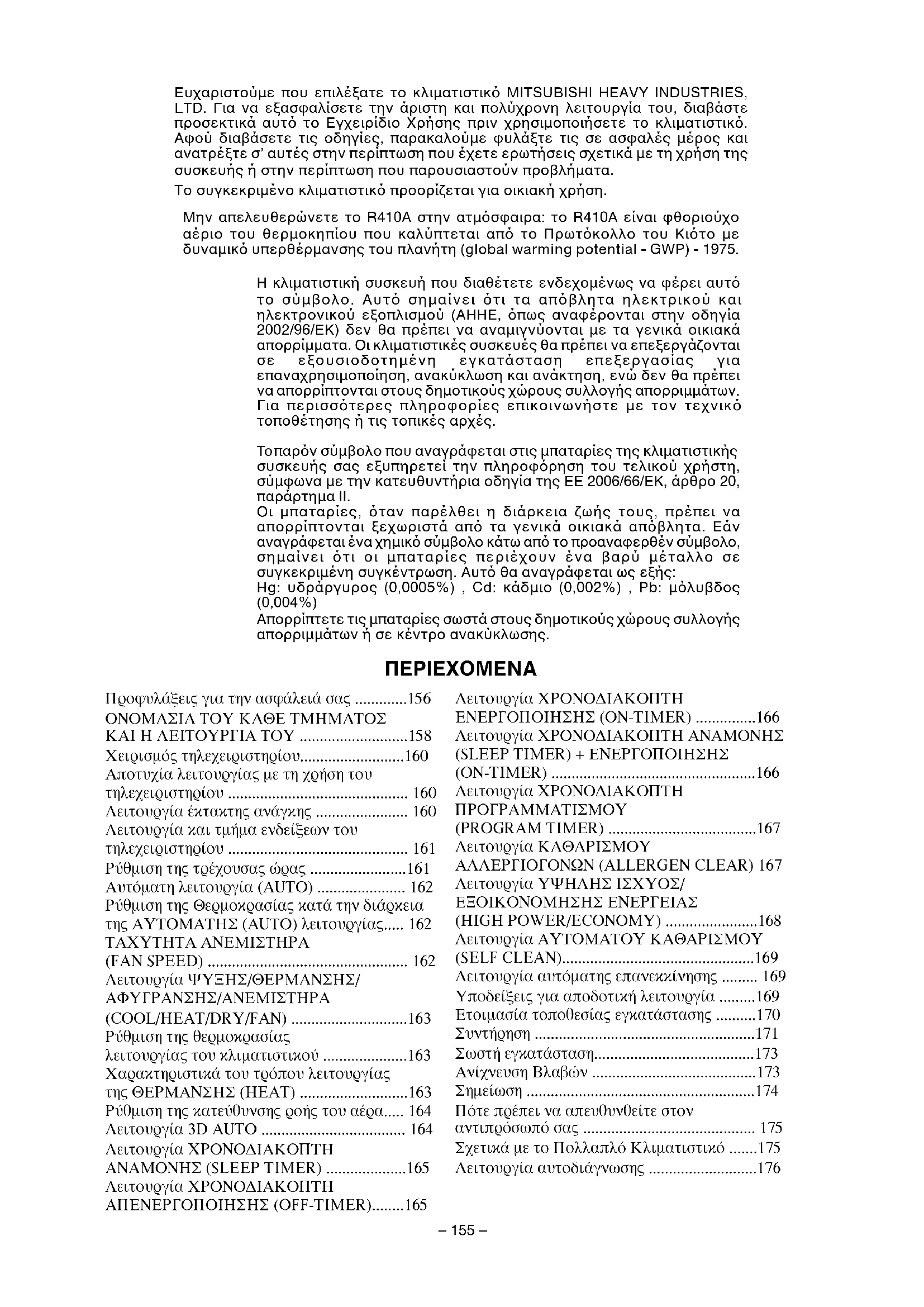 Ευχαριστούµε που επιλέξατε το κλιµατιστικ MITSUBISHI HEAVY INDUSTRIES, LTD. Για να εξασφαλίσετε την άριστη και πολύχρονη λειτουργία του, διαβάστε προσεκτικά αυτ το Εγχειρίδιο Χρήσης πριν χρησιµοποιήσετε το κλιµατιστικ. Αφού διαβάσετε τις οδηγίες, παρακαλούµε φυλάξτε τις σε ασφαλές µέρος και ανατρέξτε σ’ αυτές στην περίπτωση που έχετε ερωτήσεις σχετικά µε τη χρήση της συσκευής ή στην περίπτωση που παρουσιαστούν προβλήµατα. Το συγκεκριµένο κλιµατιστικ προορίζεται για οικιακή χρήση. ΠΕΡΙΕΧΟΜΕΝΑ Μην απελευθερώνετε το R410A στην ατµσφαιρα: το R410A είναι φθοριούχο αέριο του θερµοκηπίου που καλύπτεται απ το Πρωτκολλο του Κιτο µε δυναµικ υπερθέρµανσης του πλανήτη (global warming potential - GWP) - 1975.