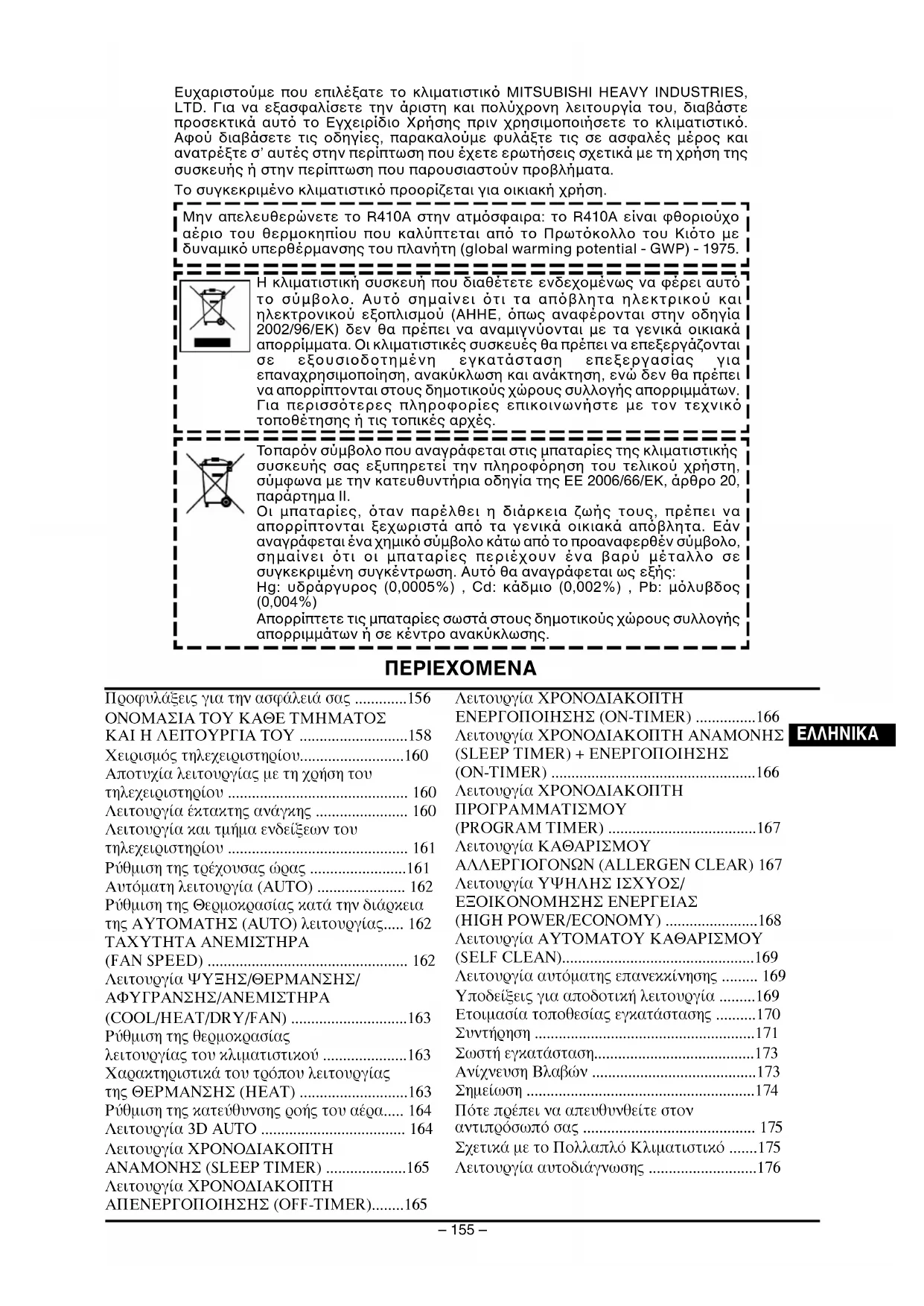 Ευχαριστούµε που επιλέξατε το κλιµατιστικ MITSUBISHI HEAVY INDUSTRIES, LTD. Για να εξασφαλίσετε την άριστη και πολύχρονη λειτουργία του, διαβάστε προσεκτικά αυτ το Εγχειρίδιο Χρήσης πριν χρησιµοποιήσετε το κλιµατιστικ. Αφού διαβάσετε τις οδηγίες, παρακαλούµε φυλάξτε τις σε ασφαλές µέρος και ανατρέξτε σ’ αυτές στην περίπτωση που έχετε ερωτήσεις σχετικά µε τη χρήση της συσκευής ή στην περίπτωση που παρουσιαστούν προβλήµατα. Το συγκεκριµένο κλιµατιστικ προορίζεται για οικιακή χρήση. ΠΕΡΙΕΧΟΜΕΝΑ Μην απελευθερώνετε το R410A στην ατµσφαιρα: το R410A είναι φθοριούχο αέριο του θερµοκηπίου που καλύπτεται απ το Πρωτκολλο του Κιτο µε δυναµικ υπερθέρµανσης του πλανήτη (global warming potential - GWP) - 1975.