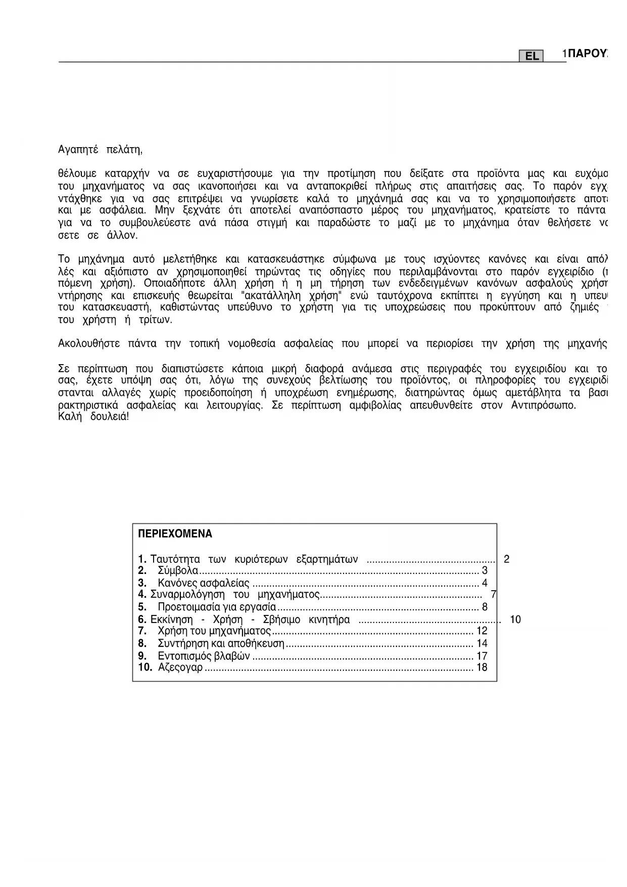 (21BPX078X) Para peças sobressalentes, use somente correntes e barras citadas acima. O uso de com- binações não aprovadas pode causar sérios ferimentos pessoais e danificar a máquina. ATENÇÃO!Αγαπητέ πελάτη, θέλουµε καταρχήν να σε ευχαριστήσουµε για την προτίµηση που δείξατε στα προϊόντα µας και ευχόµαστε η χρήση του µηχανήµατος να σας ικανοποιήσει και να ανταποκριθεί πλήρως στις απαιτήσεις σας. Το παρόν εγχειρίδιο συ- ντάχθηκε για να σας επιτρέψει να γνωρίσετε καλά το µηχάνηµά σας και να το χρησιµοποιήσετε αποτελεσµατικά και µε ασφάλεια. Μην ξεχνάτε ότι αποτελεί αναπόσπαστο µέρος του µηχανήµατος, κρατείστε το πάντα πρόχειρο για να το συµβουλεύεστε ανά πάσα στιγµή και παραδώστε το µαζί µε το µηχάνηµα όταν θελήσετε να το πουλή- σετε σε άλλον. Το µηχάνηµα αυτό µελετήθηκε και κατασκευάστηκε σύµφωνα µε τους ισχύοντες κανόνες και είναι απόλυτα ασφα- λές και αξιόπιστο αν χρησιµοποιηθεί τηρώντας τις οδηγίες που περιλαµβάνονται στο παρόν εγχειρίδιο (προβλε- πόµενη χρήση). Οποιαδήποτε άλλη χρήση ή η µη τήρηση των ενδεδειγµένων κανόνων ασφαλούς χρήσης, συ- ντήρησης και επισκευής θεωρείται "ακατάλληλη χρήση" ενώ ταυτόχρονα εκπίπτει η εγγύηση και η υπευθυνότητα του κατασκευαστή, καθιστώντας υπεύθυνο το χρήστη για τις υποχρεώσεις που προκύπτουν από ζηµιές ή βλάβες του χρήστη ή τρίτων. Ακολουθήστε πάντα την τοπική νοµοθεσία ασφαλείας που µπορεί να περιορίσει την χρήση της µηχανής. Σε περίπτωση που διαπιστώσετε κάποια µικρή διαφορά ανάµεσα στις περιγραφές του εγχειριδίου και το µηχάνηµα σας, έχετε υπόψη σας ότι, λόγω της συνεχούς βελτίωσης του προϊόντος, οι πληροφορίες του εγχειριδίου υφί- στανται αλλαγές χωρίς προειδοποίηση ή υποχρέωση ενηµέρωσης, διατηρώντας όµως αµετάβλητα τα βασικά χα- ρακτηριστικά ασφαλείας και λειτουργίας. Σε περίπτωση αµφιβολίας απευθυνθείτε στον Αντιπρόσωπο. Καλή δουλειά! ΠΕΡΙΕΧΟΜΕΝΑ