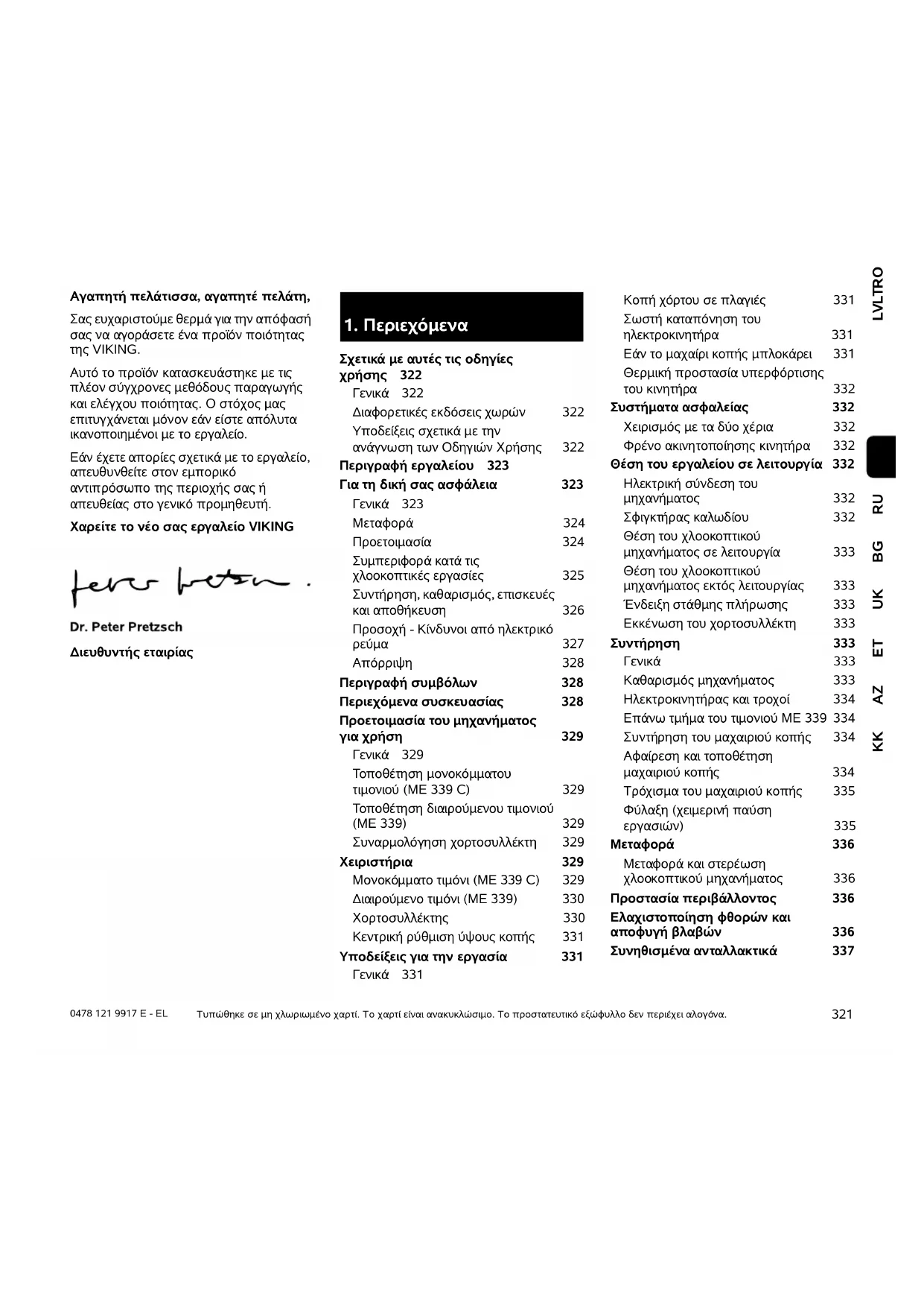 LVLTROEL 0478 121 9917 E - EL RUBGUKETAZKK Αγαπητή πελάτισσα, αγαπητέ πελάτη, Σας ευχαριστούµε θερµά για την απόφασή σας να αγοράσετε ένα προϊόν ποιότητας της VIKING. Αυτό το προϊόν κατασκευάστηκε µε τις πλέον σύγχρονες µεθόδους παραγωγής και ελέγχου ποιότητας. Ο στόχος µας επιτυγχάνεται µόνον εάν είστε απόλυτα ικανοποιηµένοι µε το εργαλείο. Εάν έχετε απορίες σχετικά µε το εργαλείο, απευθυνθείτε στον εµπορικό αντιπρόσωπο της περιοχής σας ή απευθείας στο γενικό προµηθευτή. Χαρείτε το νέο σας εργαλείο VIKING ∆ιευθυντής εταιρίας Τυπώθηκε σε µη χλωριωµένο χαρτί. Το χαρτί είναι ανακυκλώσιµο. Το προστατευτικό εξώφυλλο δεν περιέχει αλογόνα.