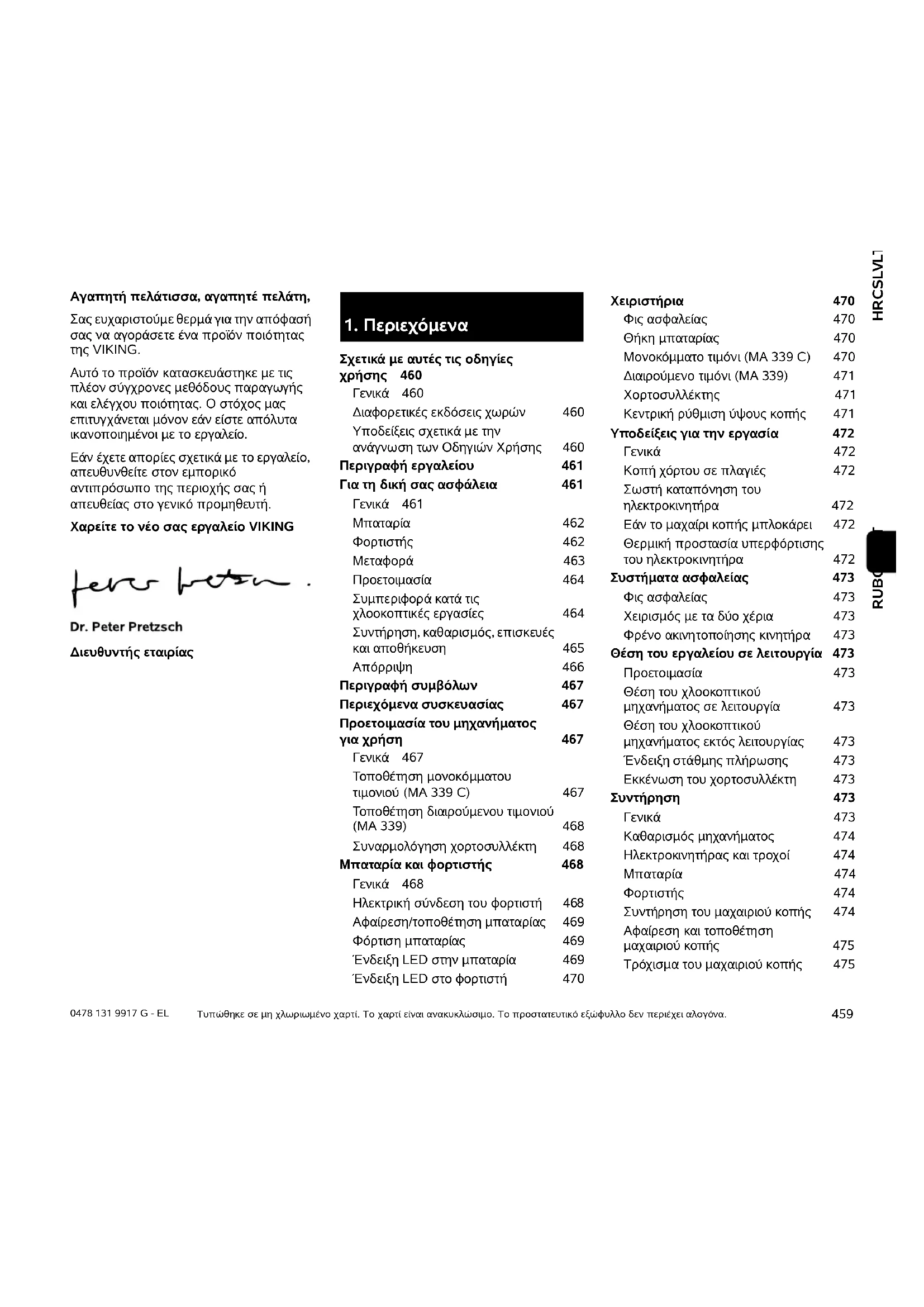 HRCSLVLTROEL 0478 131 9917 G - EL RUBGUKET Αγαπητή πελάτισσα, αγαπητέ πελάτη, Σας ευχαριστούµε θερµά για την απόφασή σας να αγοράσετε ένα προϊόν ποιότητας της VIKING. Αυτό το προϊόν κατασκευάστηκε µε τις πλέον σύγχρονες µεθόδους παραγωγής και ελέγχου ποιότητας. Ο στόχος µας επιτυγχάνεται µόνον εάν είστε απόλυτα ικανοποιηµένοι µε το εργαλείο. Εάν έχετε απορίες σχετικά µε το εργαλείο, απευθυνθείτε στον εµπορικό αντιπρόσωπο της περιοχής σας ή απευθείας στο γενικό προµηθευτή. Χαρείτε το νέο σας εργαλείο VIKING ∆ιευθυντής εταιρίας Τυπώθηκε σε µη χλωριωµένο χαρτί. Το χαρτί είναι ανακυκλώσιµο. Το προστατευτικό εξώφυλλο δεν περιέχει αλογόνα.