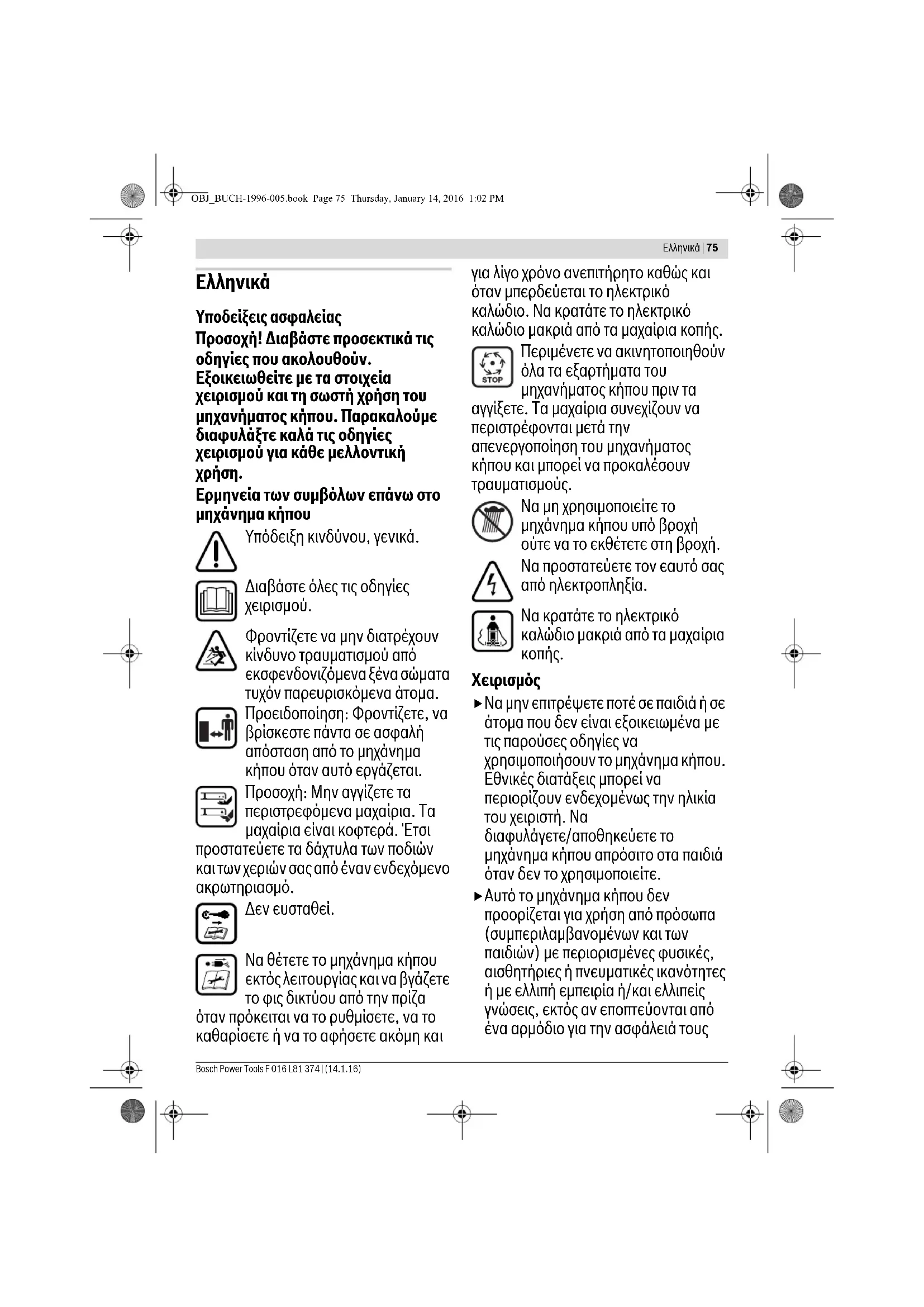 Να μην επιτρέψετε ποτέ σε παιδιά ή σε άτομα που δεν είναι εξοικειωμένα με τις παρούσες οδηγίες να χρησιμοποιήσουν το μηχάνημα κήπου. Εθνικές διατάξεις μπορεί να περιορίζουν ενδεχομένως την ηλικία του χειριστή. Να διαφυλάγετε/αποθηκεύετε το μηχάνημα κήπου απρόσιτο στα παιδιά όταν δεν το χρησιμοποιείτε. Αυτό το μηχάνημα κήπου δεν προορίζεται για χρήση από πρόσωπα (συμπεριλαμβανομένων και των παιδιών) με περιορισμένες φυσικές, αισθητήριες ή πνευματικές ικανότητες ή με ελλιπή εμπειρία ή/και ελλιπείς γνώσεις, εκτός αν εποπτεύονται από ένα αρμόδιο για την ασφάλειά τους OBJ_BUCH-1996-005.book Page 75 Thursday, January 14, 2016 1:02 PM76 | Eλληνικά F 016 L81 374 | (14.1.16) Bosch Power Tools πρόσωπο ή παίρνουν οδηγίες από το άτομο αυτό, πως πρέπει να χειρίζονται το μηχάνημα κήπου. Τα παιδιά θα πρέπει να επιτηρούνται για να εξασφαλιστεί ότι δεν θα παίξουν με το μηχάνημα κήπου. Μην εργαστείτε ποτέ με το μηχάνημα κήπου όταν βρίσκονται άμεσα κοντά άλλα άτομα, ιδιαίτερα παιδιά ή οικιακά