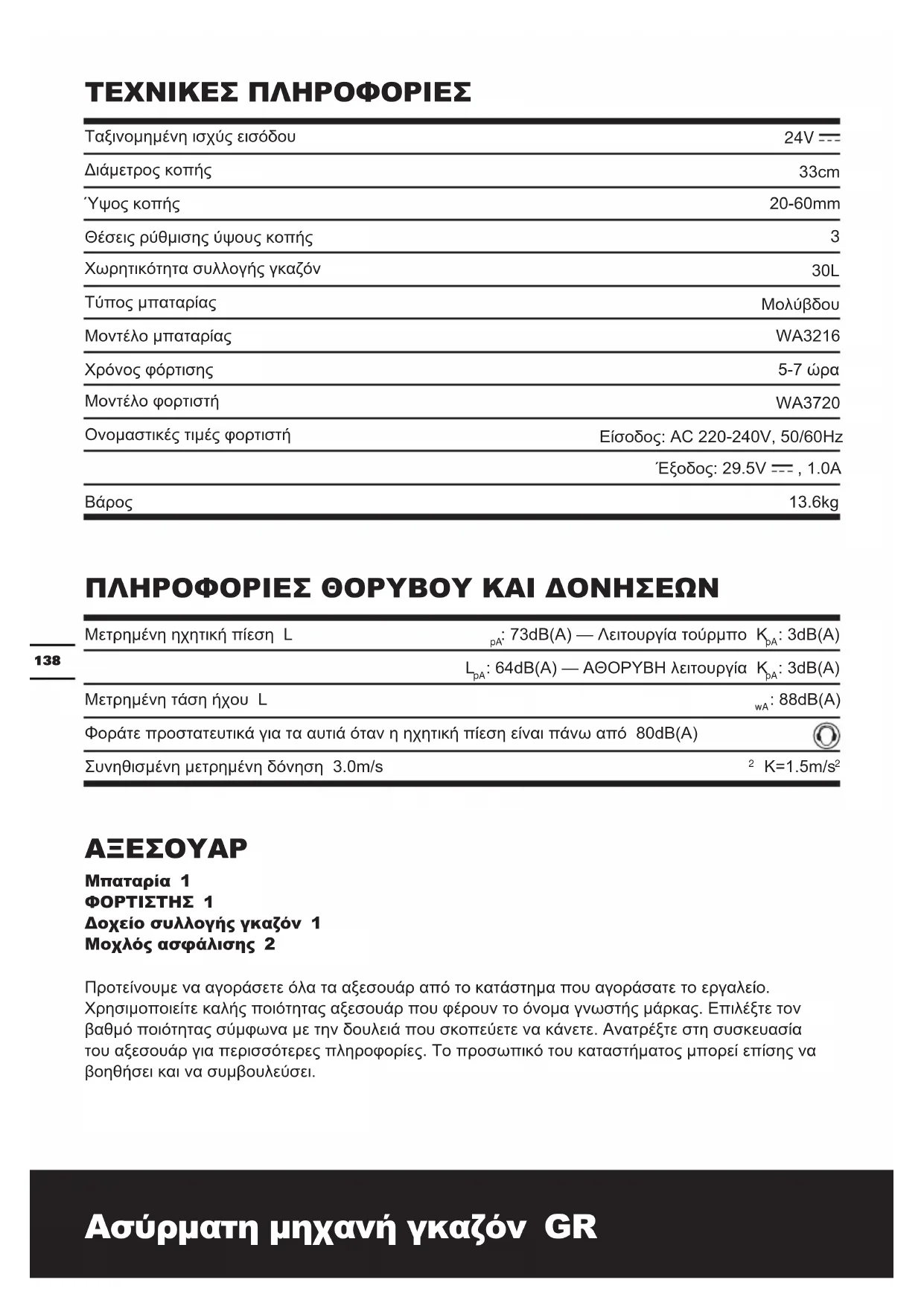 WA3216 5-7 ώρα WA3720 Είσοδος: AC 220-240V, 50/60Hz Έξοδος: 29.5V , 1.0A 13.6kg139