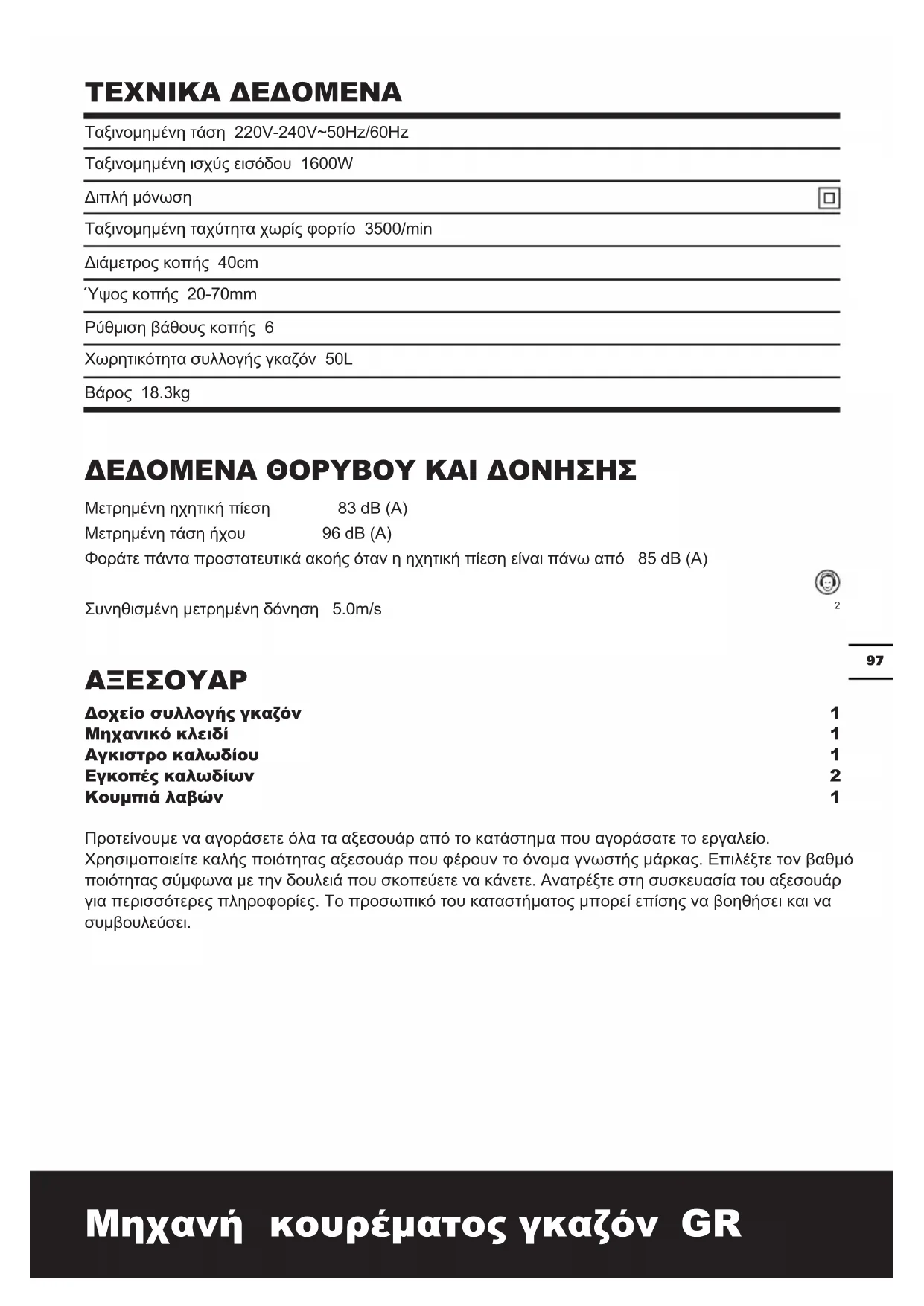 Ταξινομημένη τάση 220V-240V~50Hz/60Hz Ταξινομημένη ισχύς εισόδου 1600W Διπλή μόνωση Ταξινομημένη ταχύτητα χωρίς φορτίο 3500/min Διάμετρος κοπής 40cm Ύψος κοπής 20-70mm Ρύθμιση βάθους κοπής 6 Χωρητικότητα συλλογής γκαζόν 50L Βάρος 18.3kg