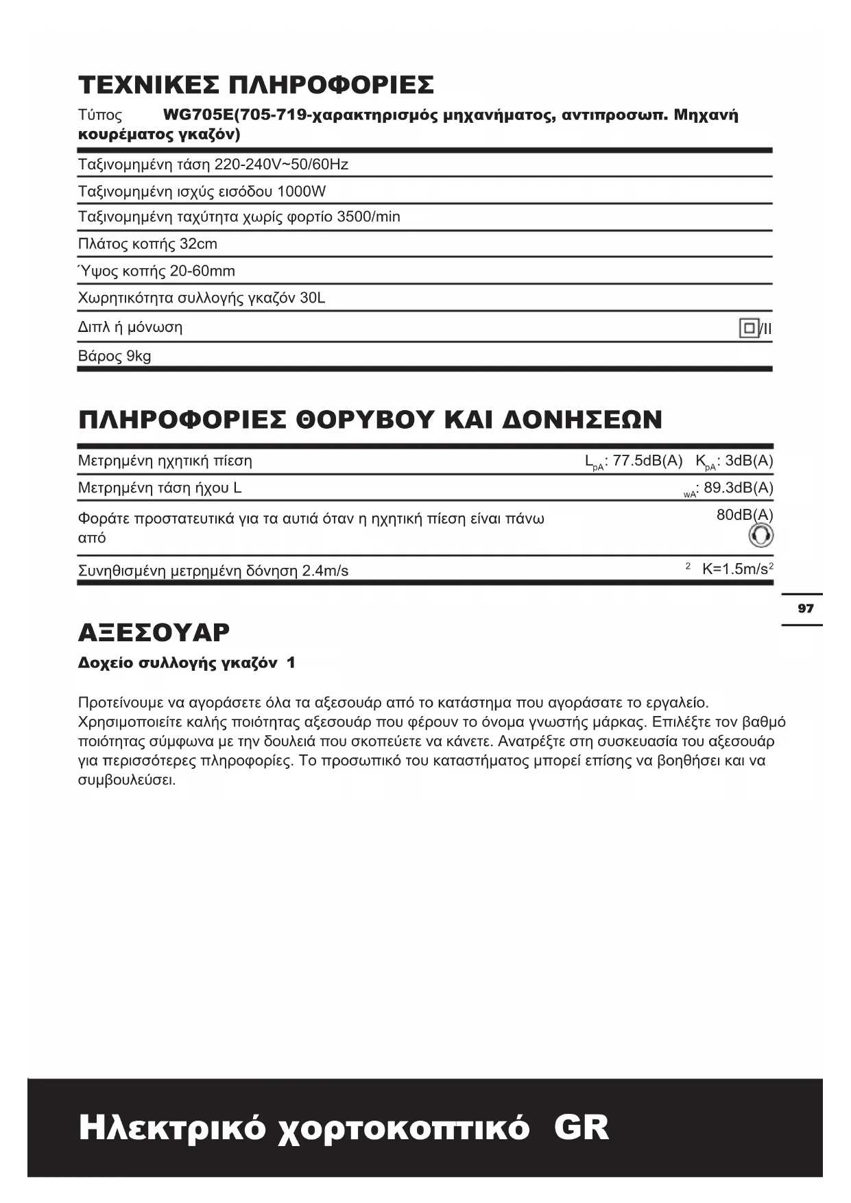 Ταξινομημένη τάση 220-240V~50/60Hz Ταξινομημένη ισχύς εισόδου 1000W Ταξινομημένη ταχύτητα χωρίς φορτίο 3500/min Πλάτος κοπής 32cm Ύψος κοπής 20-60mm Χωρητικότητα συλλογής γκαζόν 30L Διπλ ή μόνωση /II Βάρος 9kg