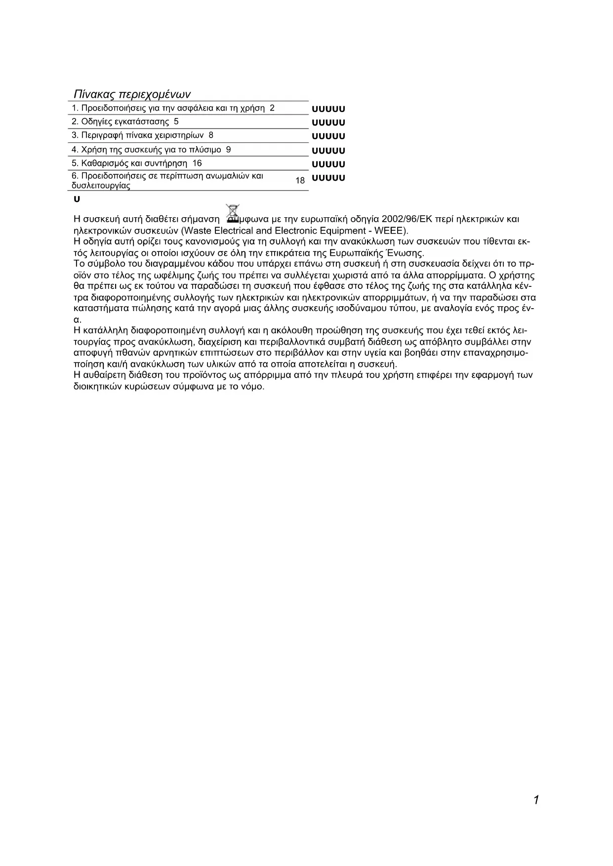 Η κατάλληλη διαφοροποιηµένη συλλογή και η ακόλουθη προώθηση της συσκευής που έχει τεθεί εκτός λει- τουργίας προς ανακύκλωση, διαχείριση και περιβαλλοντικά συµβατή διάθεση ως απόβλητο συµβάλλει στην αποφυγή πθανών αρνητικών επιπτώσεων στο περιβάλλον και στην υγεία και βοηθάει στην επαναχρησιµο- ποίηση και/ή ανακύκλωση των υλικών από τα οποία αποτελείται η συσκευή. Η αυθαίρετη διάθεση του προϊόντος ως απόρριµµα από την πλευρά του χρήστη επιφέρει την εφαρµογή των διοικητικών κυρώσεων σύµφωνα µε το νόµο.GR