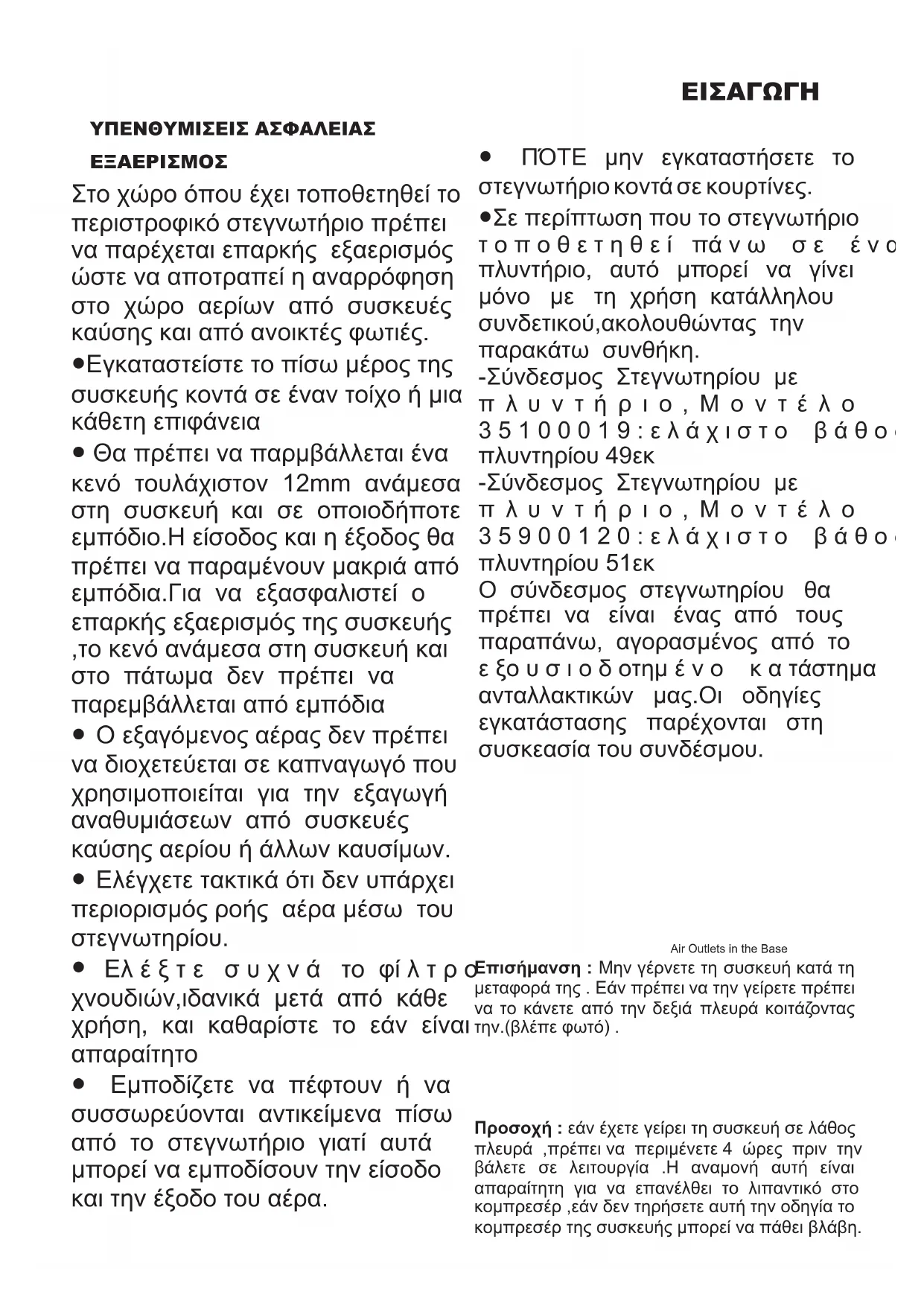 Επισήμανση : Μην γέρνετε τη συσκευή κατά τη μεταφορά της . Εάν πρέπει να την γείρετε πρέπει να το κάνετε από την δεξιά πλευρά κοιτάζοντας την.(βλέπε φωτό) . Προσοχή : εάν έχετε γείρει τη συσκευή σε λάθος πλευρά ,πρέπει να περιμένετε 4 ώρες πριν την βάλετε σε λειτουργία .Η αναμονή αυτή είναι απαραίτητη για να επανέλθει το λιπαντικό στο κομπρεσέρ ,εάν δεν τηρήσετε αυτή την οδηγία το κομπρεσέρ της συσκευής μπορεί να πάθει βλάβη. Air Outlets in the BaseΤα AHHE περιέχουν ρυπογόνες ουσίες (που μπορεί να προκαλέσουν αρνητικές συνέπειες για το περιβάλλον) και βασικά εξαρτήματα (που μπορούν να ξαναχρησιμοποιηθούν). Είναι σημαντικό να υποβάλουμε τα ΑΗΗΕ σε ειδική επεξεργασία, προκειμένου να αφαιρούνται και εναποθέτονται σωστά όλες οι ρυπογόνες ουσίες και να διατηρούνται όλα τα ανακυκλώσιμα υλικά. Οι ιδιώτες μπορούν να διαδραματίσουν σημαντικό ρόλο στη διασφάλιση ότι τα ΑΗΗΕ δεν θα αποτελέσ ουν ένα περιβ αλλοντικό ζήτ ημα, ακολουθώντας μερικούς βασικούς κανόνες : -Τα ΑΗΗΕ δεν θα πρέπει να αντιμετωπίζονται ως Οικιακά απόβλητα. -Τα ΑΗΗΕ θα πρέπει να παραδίδονται στα σχετικά σημεία περισυλλογής που διαχειρίζονται οι δήμοι ή εγκεκριμένοι οργανισμοί. Σε πολλές χώρες, για μεγάλα ΑΗΗΕ, διατίθεται υπηρεσία περισυλλογής από το σπίτι. Σε πολλές χώρες, όταν προμηθεύεστε μια νέα συσκευή, η παλαιά μπορεί να επιστραφεί στην πωλήτρια εταιρία όταν παραδίδει την καινούργια, χωρίς χρέωση, δεδομένου ότι η νέα είναι αντίστοιχη σε κατηγορία και χαρακτηριστικά με το παλαιά. Ευρωπαϊκή οδηγία 2012/19/ΕΚ ● Για να διασφαλίσετε τη συνεχόμενη ασφαλή και αποτελεσματική λειτουργία αυτής της συσκευής, συνιστούμε τα σέρβις και οι επισκευές να εκτελούνται μόνο από εξουσιοδοτημένο τεχνικό σέρβις της GIAS. Υπηρεσία Σέρβις της GIAS Αν η συσκευή δεν λειτουργεί σωστά ή υποστεί βλάβη, απενεργοποιήστε την και αποσυνδέστε το φις από την πρίζα. Για ενδεχόμενες επισκευές απευθυνθείτε στην υπηρεσία Σέρβις της GIAS. ● Όλα τα χρησιμοποιούμενα υλικά συσκευασίας είναι φιλικά προς το περιβάλλον και ανακυκλώσιμα. Παρακαλούμε να βοηθήσετε στην απόρριψη των υλικών συσκευασίας με τρόπο φιλικό προς το περιβάλλον. Οι τοπικές σας αρχές θα μπορέσουν να σας ενημερώσουν για τις λεπτομέρειες των διαθέσιμων μεθόδων απόρριψης. Για να εξασφαλίσετε την ασφαλή απόρριψη παλιού περιστροφικού στεγνωτηρίου, αποσυνδέστε το φις ρευματοληψίας από την πρίζα, κόψτε το καλώδιο ρεύματος και καταστρέψτε το μαζί με το φις. Για να αποτρέψετε την παγίδευση παιδιών μέσα στη συσκευή σπάστε τους μεντεσέδες ή την ασφάλιση της