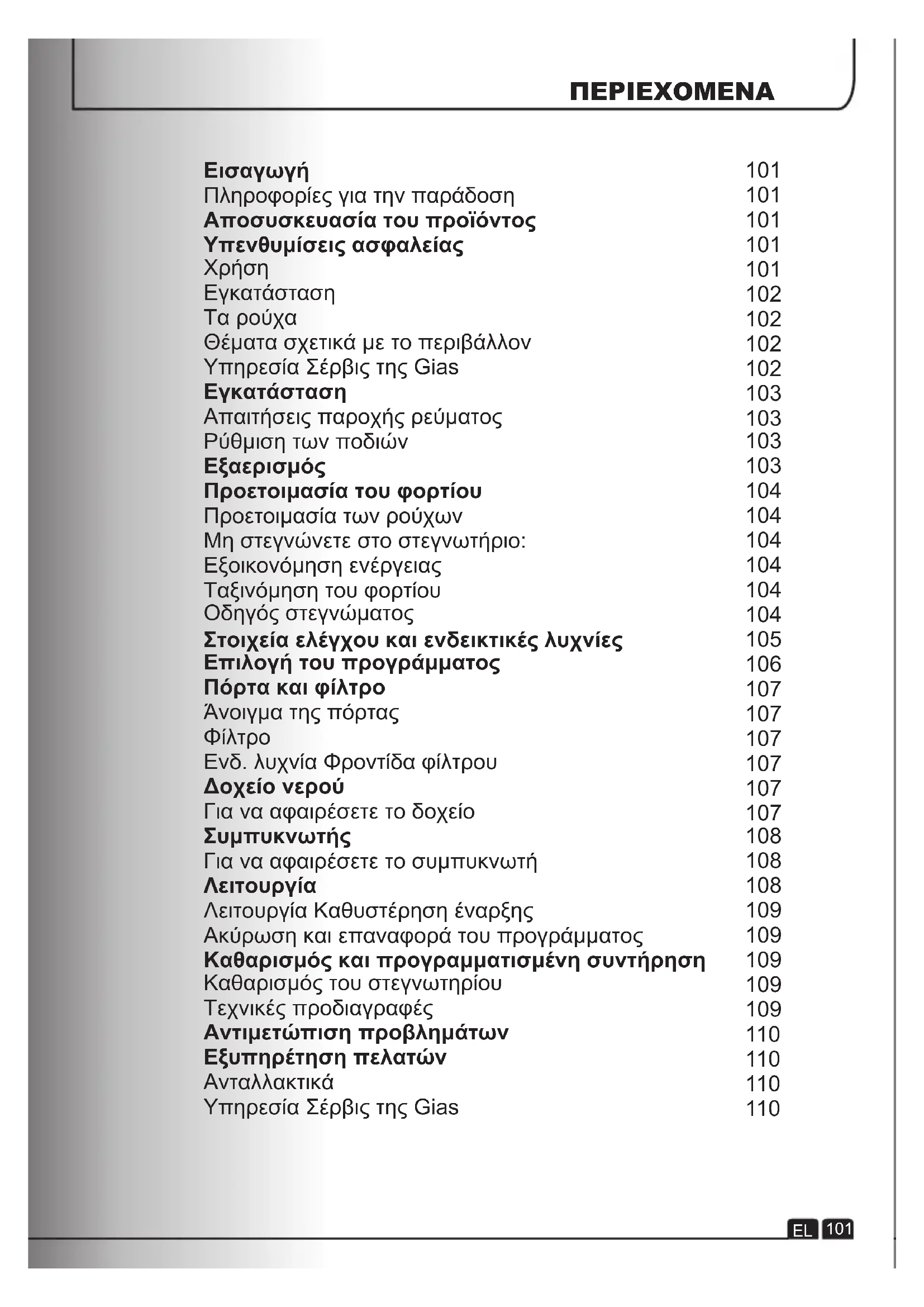 Λειτουργία Καθυστέρηση έναρξης Ακύρωση και επαναφορά του προγράμματος Καθαρισμός και προγραμματισμένη συντήρηση Καθαρισμός του στεγνωτηρίου Τεχνικές προδιαγραφές Αντιμετώπιση προβλημάτων Εξυπηρέτηση πελατών Ανταλλακτικά Υπηρεσία Σέρβις της Gias ΠΕΡΙΕΧΟΜΕΝΑ