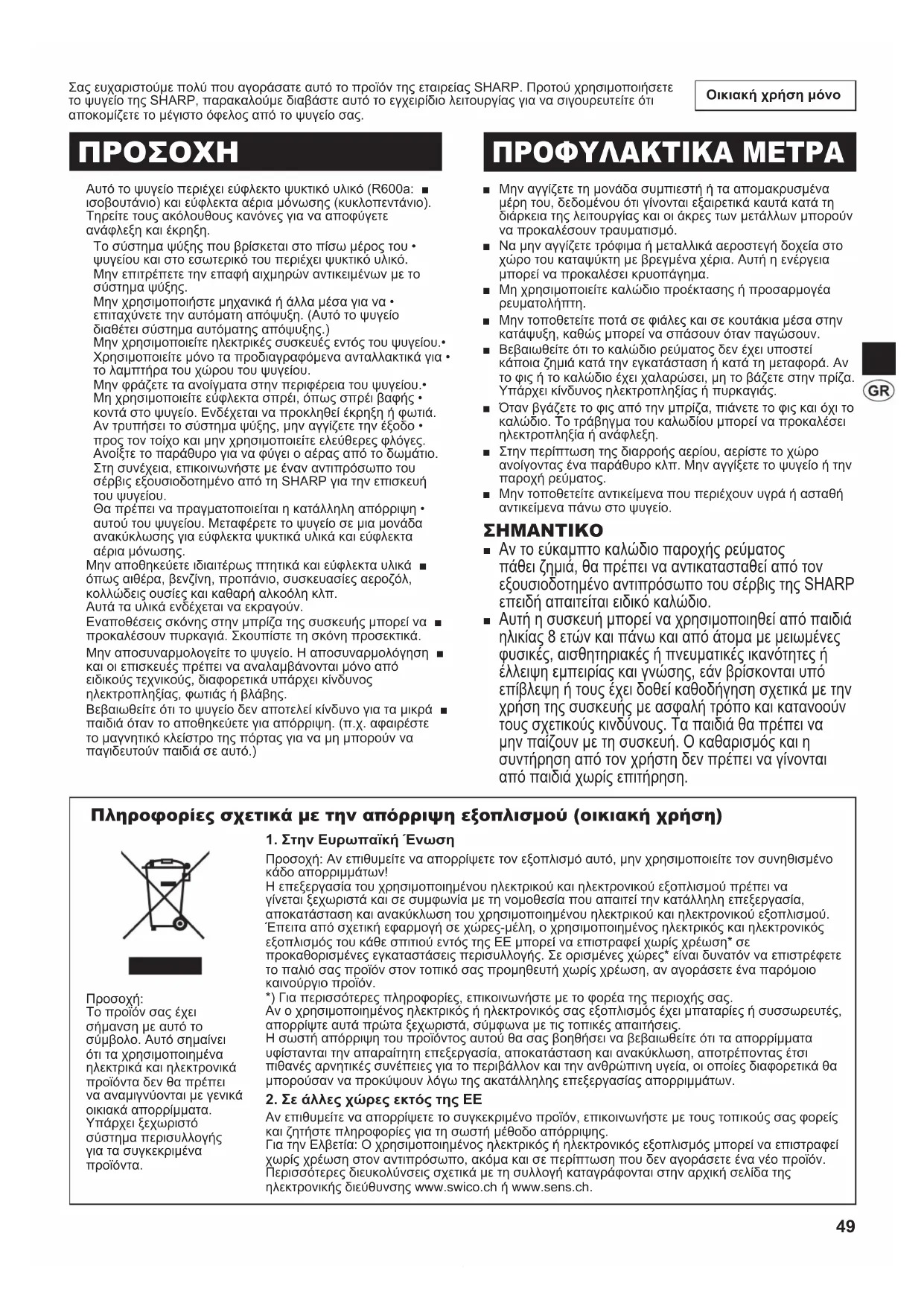 Αν το εύκαμπτο καλώδιο παροχής ρεύματος πάθει ζημιά, θα πρέπει να αντικατασταθεί από τον εξουσιοδοτημένο αντιπρόσωπο του σέρβις της SHARP επειδή απαιτείται ειδικό καλώδιο.