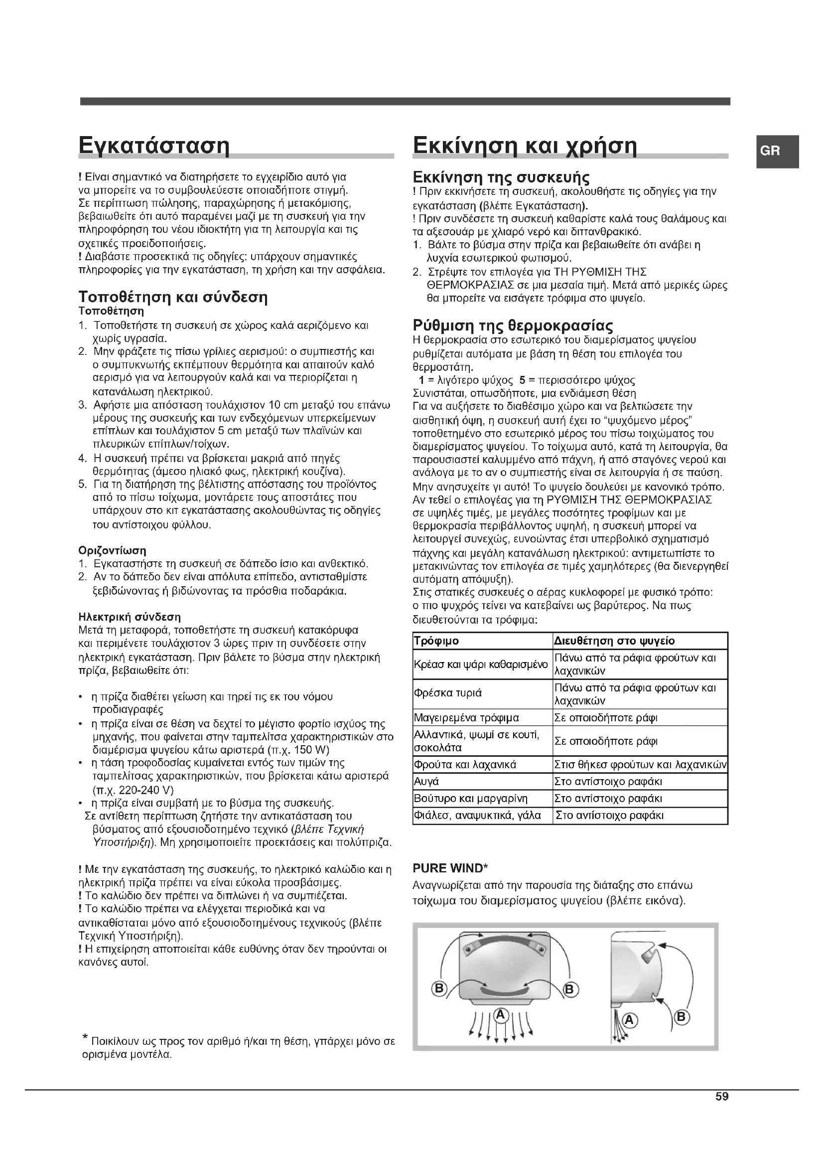 - Ποικίλουν ως προς τον αριθμό ή/και τη θέση, γπάρχει μόνο σε ορισμένα μοντέλα. Το Pure Wind βελτιστοποιεί στο μέγιστο την κυκλοφορία του αέρα, βελτιώνοντας την αποτελεσματικότητα του εξατμιστή και συντελώντας στην ταχύτερη επίτευξη της σωστής θερμοκρασίας στο εσωτερικό του ψυγείου μετά από κάθε άνοιγμα. O αέρας που εμφυσείται (A) ψύχεται σε επαφή με το ψυχρό τοίχωμα, ενώ ο πιο θερμός αέρας (B) απορροφάται (βλέπε εικόνα) Πώς να χρησιμοποιείτε καλύτερα το