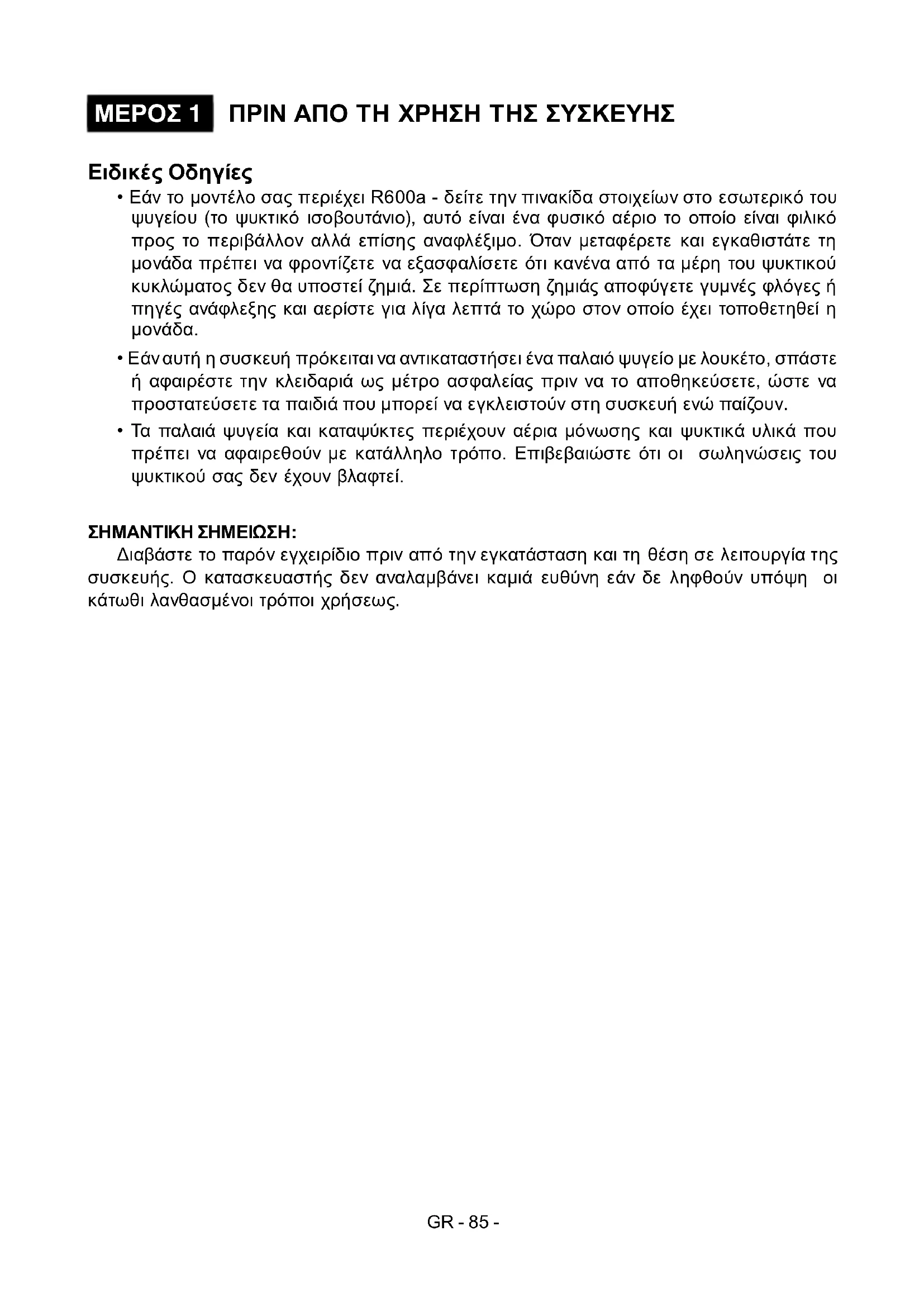 - Τα παλαιά ψυγεία και καταψύκτες περιέχουν αέρια μόνωσης και ψυκτικά υλικά που πρέπει να αφαιρεθούν με κατάλληλο τρόπο. Επιβεβαιώστε ότι οι σωληνώσεις του ψυκτικού σας δεν έχουν βλαφτεί. ΣΗΜΑΝΤΙΚΗ ΣΗΜΕΙΩΣΗ: Διαβάστε το παρόν εγχειρίδιο πριν από την εγκατάσταση και τη θέση σε λειτουργία της συσκευής. Ο κατασκευαστής δεν αναλαμβάνει καμιά ευθύνη εάν δε ληφθούν υπόψη οι κάτωθι λανθασμένοι τρόποι χρήσεως. PDF created with pdfFactory Pro trial version www.pdffactory.comGR - 86 -