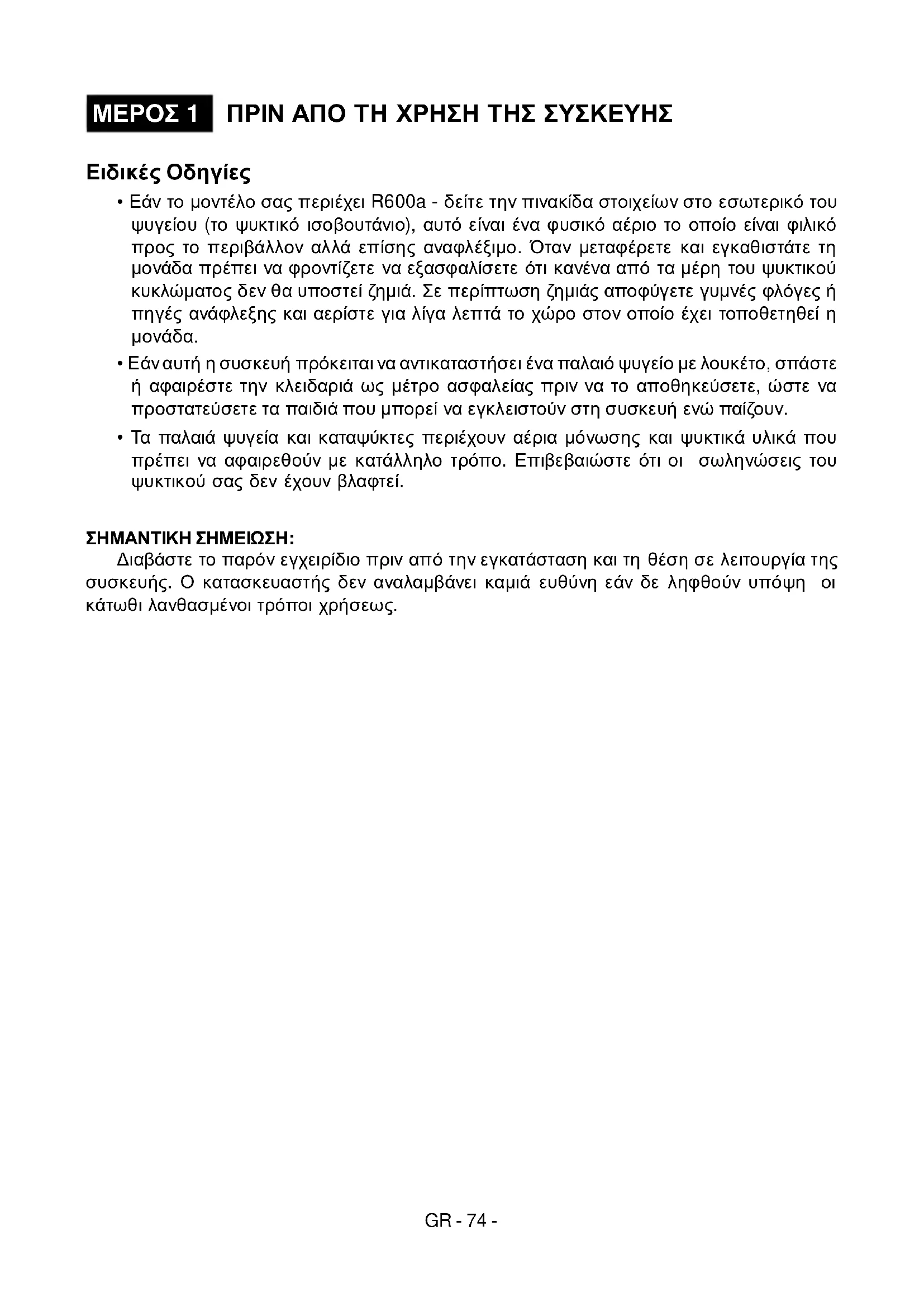 - Τα παλαιά ψυγεία και καταψύκτες περιέχουν αέρια μόνωσης και ψυκτικά υλικά που πρέπει να αφαιρεθούν με κατάλληλο τρόπο. Επιβεβαιώστε ότι οι σωληνώσεις του ψυκτικού σας δεν έχουν βλαφτεί. ΣΗΜΑΝΤΙΚΗ ΣΗΜΕΙΩΣΗ: Διαβάστε το παρόν εγχειρίδιο πριν από την εγκατάσταση και τη θέση σε λειτουργία της συσκευής. Ο κατασκευαστής δεν αναλαμβάνει καμιά ευθύνη εάν δε ληφθούν υπόψη οι κάτωθι λανθασμένοι τρόποι χρήσεως. PDF created with pdfFactory Pro trial version www.pdffactory.comGR - 75 -