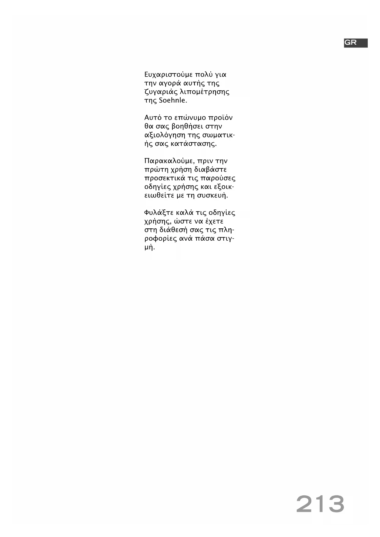 BA63721slimF5_120863_V10.qxd:BA63721slimF5_120863_V9.qxd 05.01.2010 13:23 Uhr Seite 212213 Ευχαριστούµε πολύ για την αγορά αυτής της ζυγαριάς λιποµέτρησης της Soehnle. Αυτό το επώνυµο προϊόν θα σας βοηθήσει στην αξιολόγηση της σωµατικ- ής σας κατάστασης. Παρακαλούµε, πριν την πρώτη χρήση διαβάστε προσεκτικά τις παρούσες οδηγίες χρήσης και εξοικ- ειωθείτε µε τη συσκευή. Φυλάξτε καλά τις οδηγίες χρήσης, ώστε να έχετε στη διάθεσή σας τις πλη- ροφορίες ανά πάσα στιγ-