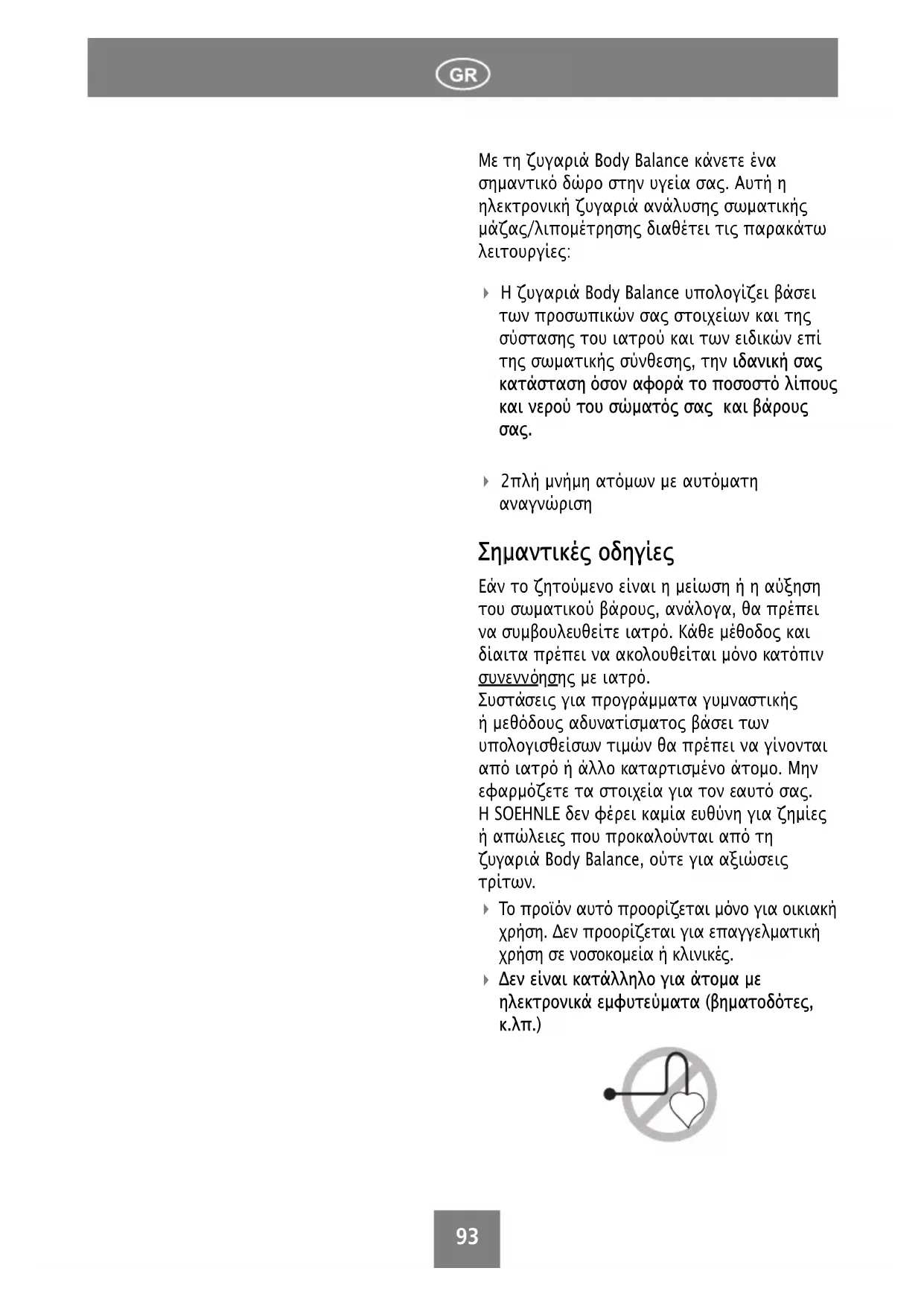 ησης µε ιατρό. Συστάσεις για προγράµµατα γυµναστικής ή µεθόδους αδυνατίσµατος βάσει των υπολογισθείσων τιµών θα πρέπει να γίνονται από ιατρό ή άλλο καταρτισµένο άτοµο. Μην εφαρµόζετε τα στοιχεία για τον εαυτό σας. Η SOEHNLE δεν φέρει καµία ευθύνη για ζηµίες ή απώλειες που προκαλούνται από τη ζυγαριά Body Balance, ούτε για αξιώσεις
