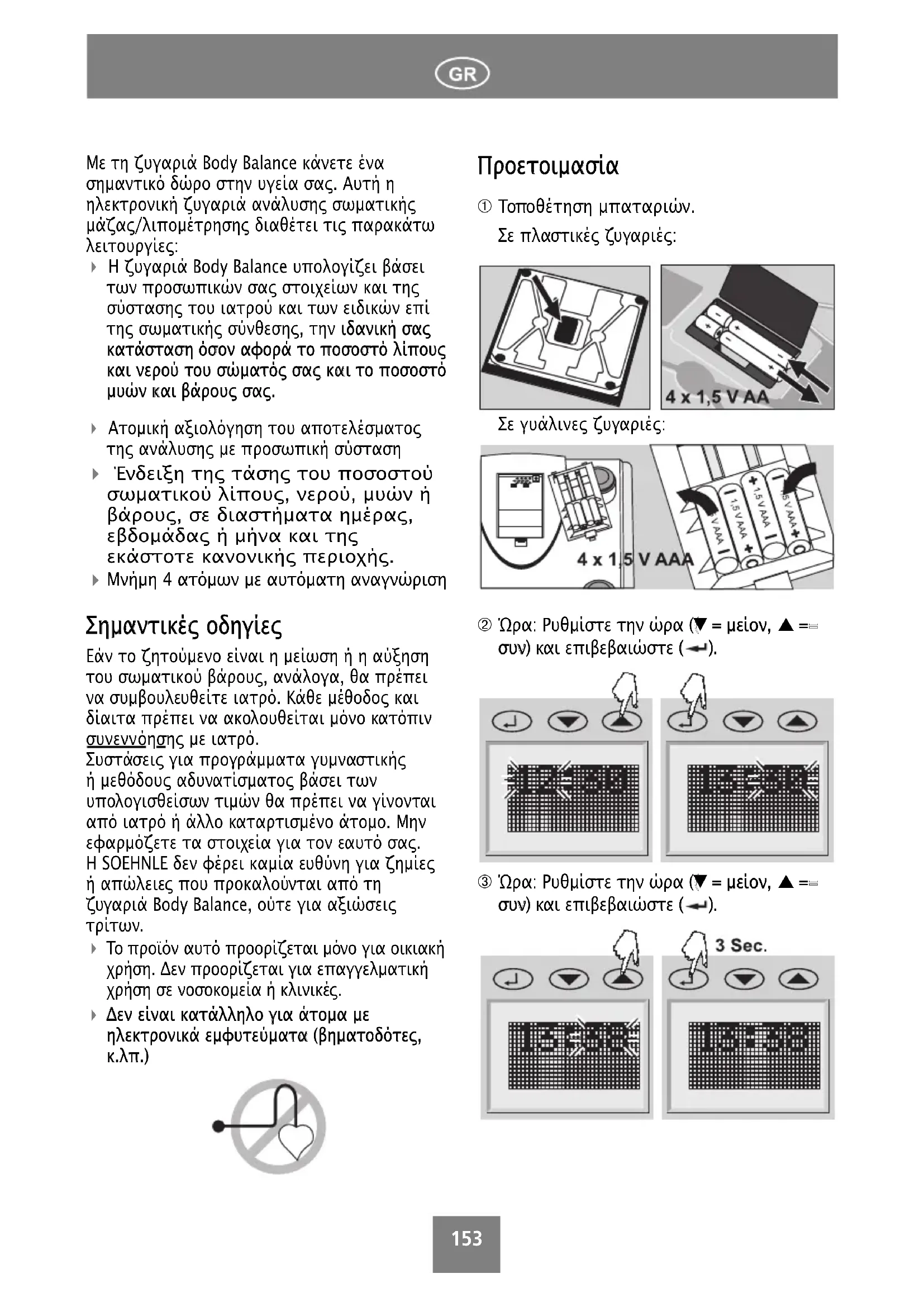 όησης µε ιατρό. Συστάσεις για προγράµµατα γυµναστικής ή µεθόδους αδυνατίσµατος βάσει των υπολογισθείσων τιµών θα πρέπει να γίνονται από ιατρό ή άλλο καταρτισµένο άτοµο. Μην εφαρµόζετε τα στοιχεία για τον εαυτό σας. Η SOEHNLE δεν φέρει καµία ευθύνη για ζηµίες ή απώλειες που προκαλούνται από τη ζυγαριά Body Balance, ούτε για αξιώσεις