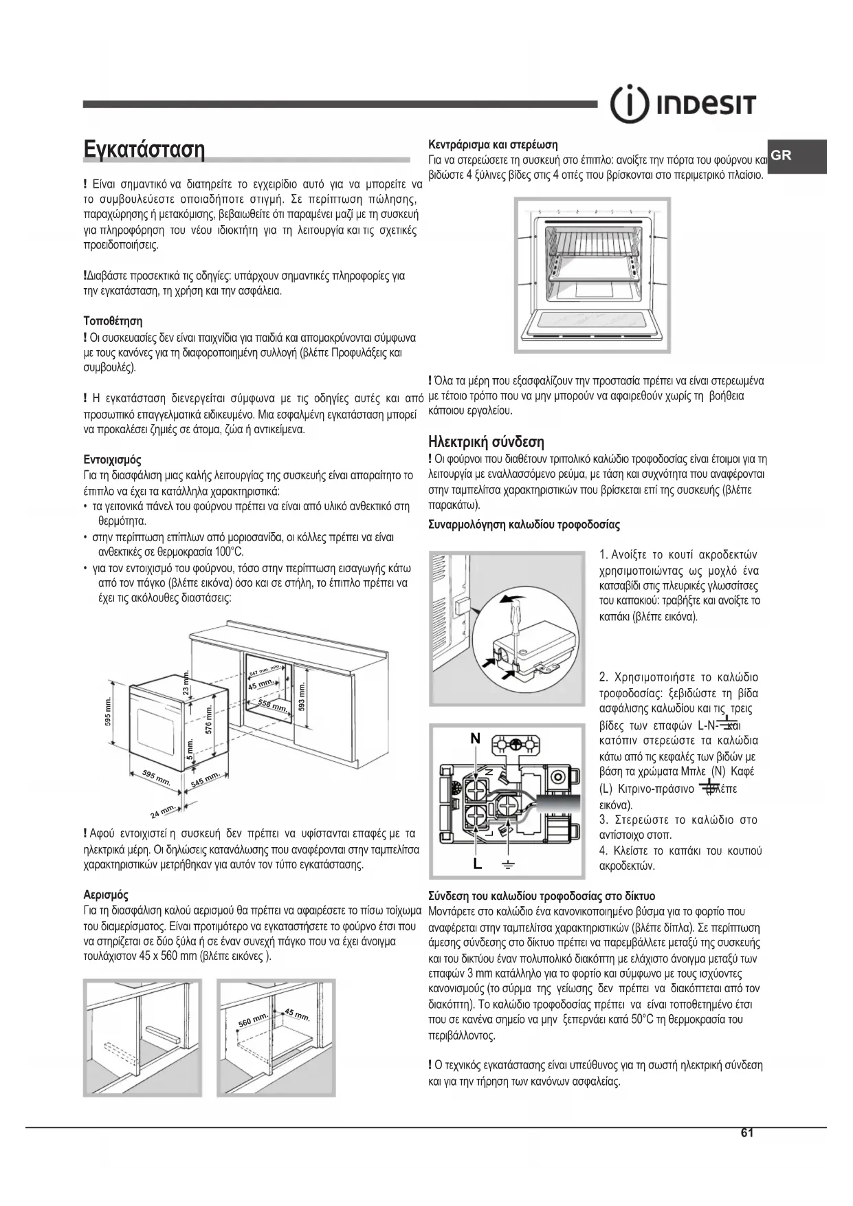 Για τη διασφάλιση καλού αερισμού θα πρέπει να αφαιρέσετε το πίσω τοίχωμα του διαμερίσματος. Είναι προτιμότερο να εγκαταστήσετε το φούρνο έτσι που να στηρίζεται σε δύο ξύλα ή σε έναν συνεχή πάγκο που να έχει άνοιγμα τουλάχιστον 45 x 560 mm (βλέπε εικόνες ). 560 mm. 45 mm. Κεντράρισμα και στερέωση Για να στερεώσετε τη συσκευή στο έπιπλο: ανοίξτε την πόρτα του φούρνου και βιδώστε 4 ξύλινες βίδες στις 4 οπές που βρίσκονται στο περιμετρικό πλαίσιο. ! Όλα τα μέρη που εξασφαλίζουν την προστασία πρέπει να είναι στερεωμένα με τέτοιο τρόπο που να μην μπορούν να αφαιρεθούν χωρίς τη βοήθεια κάποιου εργαλείου. Ηλεκτρική σύνδεση ! Οι φούρνοι που διαθέτουν τριπολικό καλώδιο τροφοδοσίας είναι έτοιμοι για τη λειτουργία με εναλλασσόμενο ρεύμα, με τάση και συχνότητα που αναφέρονται στην ταμπελίτσα χαρακτηριστικών που βρίσκεται επί της συσκευής (βλέπε