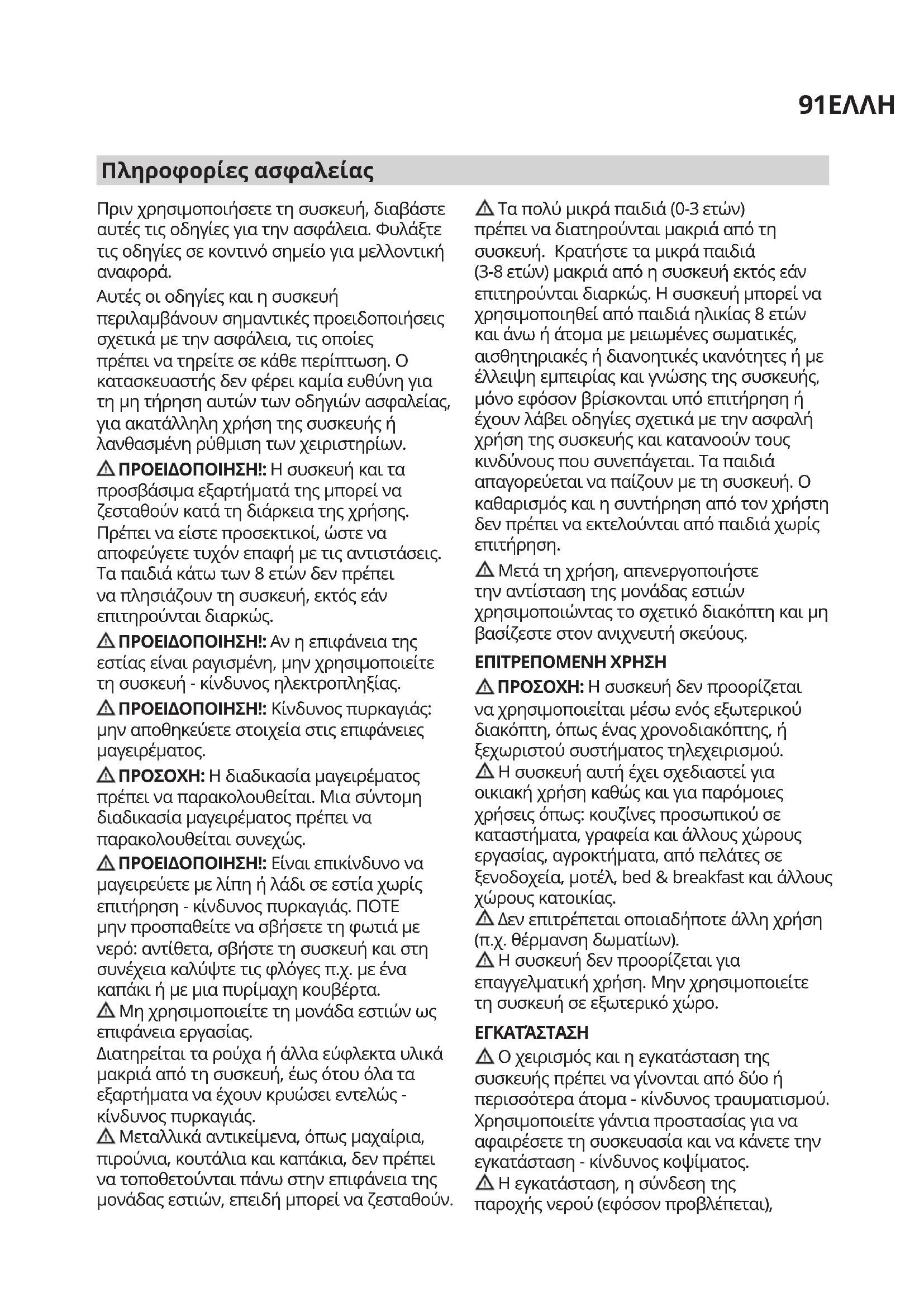 Μετά τη χρήση, απενεργοποιήστε την αντίσταση της μονάδας εστιών χρησιμοποιώντας το σχετικό διακόπτη και μη βασίζεστε στον ανιχνευτή σκεύους. ΕΠΙΤΡΕΠΟΜΕΝΗΧΡΗΣΗ ΠΡΟΣΟΧΗ:Η συσκευή δεν προορίζεται να χρησιμοποιείται μέσω ενός εξωτερικού διακόπτη, όπως ένας χρονοδιακόπτης, ή ξεχωριστού συστήματος τηλεχειρισμού. Η συσκευή αυτή έχει σχεδιαστεί για οικιακή χρήση καθώς και για παρόμοιες χρήσεις όπως: κουζίνες προσωπικού σε καταστήματα, γραφεία και άλλους χώρους εργασίας, αγροκτήματα, από πελάτες σε ξενοδοχεία, μοτέλ, bed & breakfast και άλλους χώρους κατοικίας. Δεν επιτρέπεται οποιαδήποτε άλλη χρήση (π.χ. θέρμανση δωματίων). Η συσκευή δεν προορίζεται για επαγγελματική χρήση. Μην χρησιμοποιείτε τη συσκευή σε εξωτερικό χώρο. ΕΓΚΑΤΆΣΤΑΣΗ Ο χειρισμός και η εγκατάσταση της συσκευής πρέπει να γίνονται από δύο ή περισσότερα άτομα - κίνδυνος τραυματισμού. Χρησιμοποιείτε γάντια προστασίας για να αφαιρέσετε τη συσκευασία και να κάνετε την εγκατάσταση - κίνδυνος κοψίματος. Η εγκατάσταση, η σύνδεση της παροχής νερού (εφόσον προβλέπεται),92 οι ηλεκτρικές συνδέσεις και επισκευές πρέπει να πραγματοποιούνται από εξειδικευμένο τεχνικό. Μην επισκευάζετε και μην αντικαθιστάτε κανένα εξάρτημα της συσκευής, εκτός εάν αναφέρεται ρητά στο εγχειρίδιο χρήσης. Κρατήστε τα παιδιά μακριά από το χώρο εγκατάστασης. Μετά από την αποσυσκευασία της συσκευής, βεβαιωθείτε ότι δεν έχει προκληθεί ζημιά σε αυτήν κατά τη μεταφορά. Σε περίπτωση προβλημάτων, επικοινωνήστε με τον αντιπρόσωπο ή με το πλησιέστερο τμήμα εξυπηρέτησης πελατών. Μετά την εγκατάσταση, τα υλικά συσκευασίας (πλαστικά, φελιζόλ, κ.λπ.) πρέπει να φυλάσσονται μακριά από τα παιδιά - κίνδυνος ασφυξίας. Η συσκευή πρέπει να αποσυνδέεται από την ηλεκτρική τροφοδοσία πριν από κάθε εργασία εγκατάστασης - κίνδυνος ηλεκτροπληξίας. Κατά την εγκατάσταση, βεβαιωθείτε ότι δεν έχει προκληθεί ζημιά στο καλώδιο τροφοδοσίας από τη συσκευή - κίνδυνος πυρκαγιάς ή ηλεκτροπληξίας. Ενεργοποιήστε τη συσκευή μόνο εφόσον ολοκληρωθεί η εγκατάσταση. Εκτελέστε όλες τις εργασίες κοπής του επίπλου πριν τοποθετήσετε τη συσκευή στη θέση της και αφαιρέστε προσεκτικά όλα τα ροκανίδια και τα πριονίδια. Αν η συσκευή δεν εγκατασταθεί πάνω σε ένα φούρνο, πρέπει να τοποθετηθεί ένα διαχωριστικό πάνελ (δεν περιλαμβάνεται) στο χώρο κάτω από τη συσκευή. ΗΛΕΚΤΡΙΚΕΣΠΡΟΕΙΔΟΠΟΙΗΣΕΙΣ Πρέπει να είναι δυνατή η αποσύνδεση της συσκευής από την ηλεκτρική τροφοδοσία με αφαίρεση του φις εάν η πρίζα είναι προσβάσιμη ή με χρήση του πολυπολικού διακόπτη που έχει εγκατασταθεί πριν από την πρίζα σύμφωνα με τα εθνικά πρότυπα ηλεκτρικής ασφάλειας και η συσκευή πρέπει να διαθέτει γείωση με βάση τα εθνικά πρότυπα ασφαλείας. Μη χρησιμοποιείτε καλώδια προέκτασης (μπαλαντέζες), πολύπριζα ή προσαρμογείς. Μετά την ολοκλήρωση της εγκατάστασης, δεν πρέπει να είναι δυνατή η πρόσβαση στα ηλεκτρικά εξαρτήματα. Μην χρησιμοποιείτε τη συσκευή όταν είστε βρεγμένος ή με γυμνά