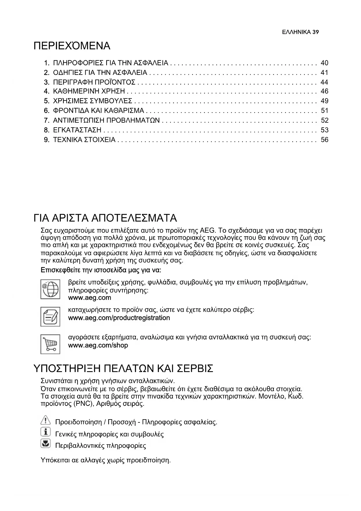 8. ΕΓΚΑΤΆΣΤΑΣΗ . . . . . . . . . . . . . . . . . . . . . . . . . . . . . . . . . . . . . . . . . . . . . . . . . . . . . . . . 53 9. ΤΕΧΝΙΚΑ ΣΤΟΙΧΕΙΑ . . . . . . . . . . . . . . . . . . . . . . . . . . . . . . . . . . . . . . . . . . . . . . . . . . . . 56 ΓΙΑ ΑΡΙΣΤΑ ΑΠΟΤΕΛΕΣΜΑΤΑ Σας ευχαριστούμε που επιλέξατε αυτό το προϊόν της AEG. Το σχεδιάσαμε για να σας παρέχει άψογη απόδοση για πολλά χρόνια, με πρωτοποριακές τεχνολογίες που θα κάνουν τη ζωή σας πιο απλή και με χαρακτηριστικά που ενδεχομένως δεν θα βρείτε σε κοινές συσκευές. Σας παρακαλούμε να αφιερώσετε λίγα λεπτά και να διαβάσετε τις οδηγίες, ώστε να διασφαλίσετε την καλύτερη δυνατή χρήση της συσκευής σας. Επισκεφθείτε την ιστοσελίδα μας για να: βρείτε υποδείξεις χρήσης, φυλλάδια, συμβουλές για την επίλυση προβλημάτων, πληροφορίες συντήρησης: www.aeg.com καταχωρήσετε το προϊόν σας, ώστε να έχετε καλύτερο σέρβις: www.aeg.com/productregistration αγοράσετε εξαρτήματα, αναλώσιμα και γνήσια ανταλλακτικά για τη συσκευή σας: www.aeg.com/shop ΥΠΟΣΤΗΡΙΞΗ ΠΕΛΑΤΩΝ ΚΑΙ ΣΕΡΒΙΣ Συνιστάται η χρήση γνήσιων ανταλλακτικών. Όταν επικοινωνείτε με το σέρβις, βεβαιωθείτε ότι έχετε διαθέσιμα τα ακόλουθα στοιχεία. Τα στοιχεία αυτά θα τα βρείτε στην πινακίδα τεχνικών χαρακτηριστικών. Μοντέλο, Κωδ. προϊόντος (PNC), Αριθμός σειράς. Προειδοποίηση / Προσοχή - Πληροφορίες ασφαλείας. Γενικές πληροφορίες και συμβουλές Περιβαλλοντικές πληροφορίες Υπόκειται αε αλλαγές χωρίς προειδποίηση. ΕΛΛΗΝΙΚΑ 391. ΠΛΗΡΟΦΟΡΊΕΣ ΓΙΑ ΤΗΝ ΑΣΦΆΛΕΙΑ Πριν από την εγκατάσταση και τη χρήση της συσκευής, διαβάστε προσεκτικά τις παρεχόμενες οδηγίες. Ο κατα‐ σκευαστής δεν ευθύνεται αν προκληθεί τραυματισμός ή ζημιά από λανθασμένη εγκατάσταση και χρήση. Να φυ‐ λάσσετε πάντα αυτές τις οδηγίες μαζί με τη συσκευή για μελλοντική αναφορά.