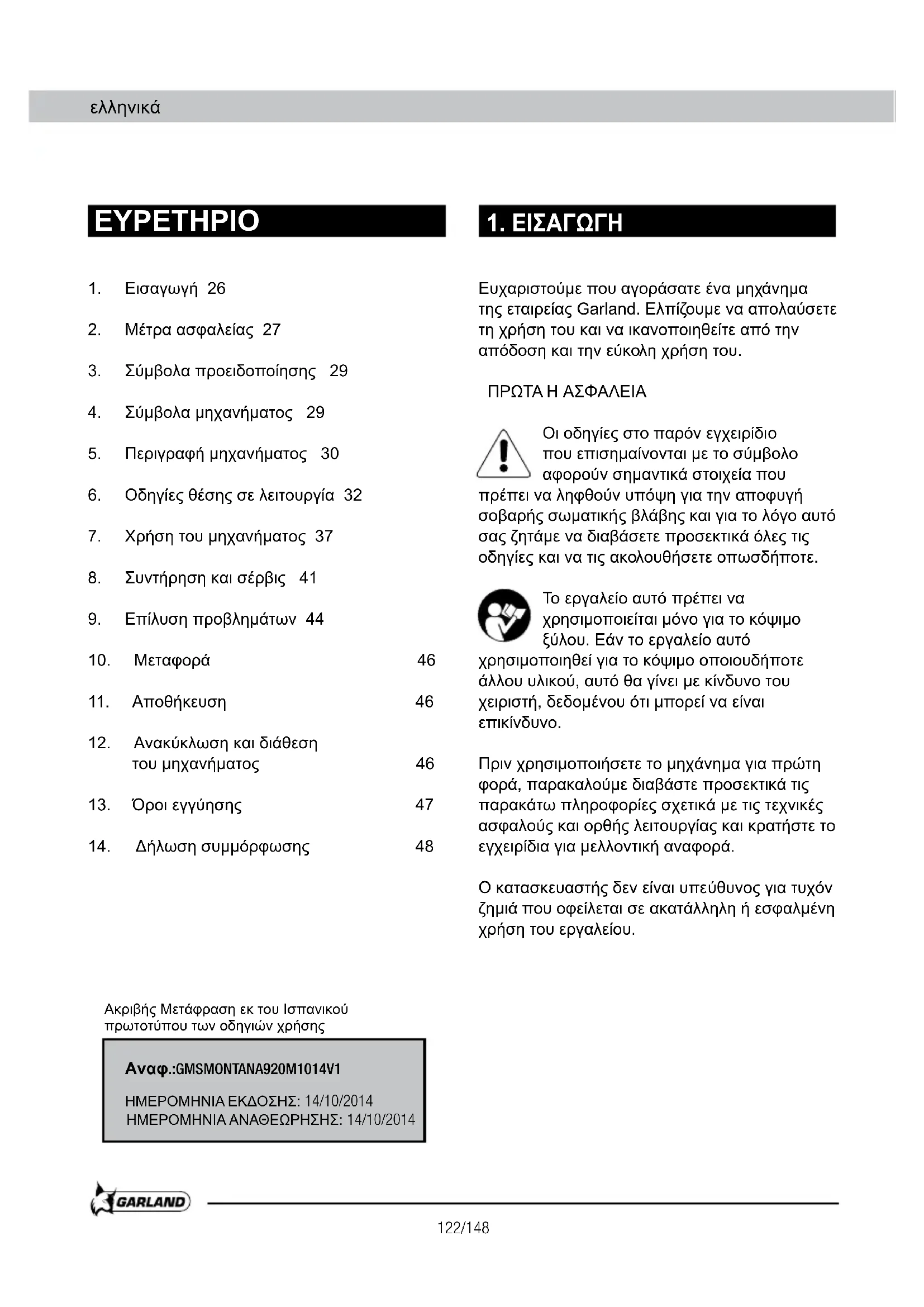 O katwoti UTOyEvpaMuEvoc, Lisardo Carballal, EouoiobotmuEvoc aTOn Tnv Products McLand S.L., e Tnv Tnapakatw dEuvon C/La Fragua 22, 28932, Mostoles, Espana, oNawei ot ta Tpoiovta tnc mapkacGarland ouvtela MONTANA 920 (YD5552), e auovta apiOTo Tou etouc 2014 kai eTAC (to eTOC kataoekun cATAdeikvuetai ePavoc OTNV TIVAKda avaywipionc Tou epyaaleiou, aKolouoouevo aTOn ToV auovta apiO) kai n aeitoupyia tou onoiou eivai "Mxavmae KInnpa, katalan yia ToV kaopioq xooataNTWv, mvotatiwv, dpouwv, odowv, kAIT. aTPOuulaa kai loiTuaiká, epon pEuMaOc aepa uynlnc Taxutntac," ouuppovvetai eOeTc attaitnoeic TOn avapepovtai OTNV Odyia 2006/42/EK Tou Eupwniaokou Koivobouliou kai Tou Suubouliou tns 17nS Maou 2006 oxetiká e Ta mnxavnma tka Tnv TpOTTOINs TnC obnyiac 95/16/EK.