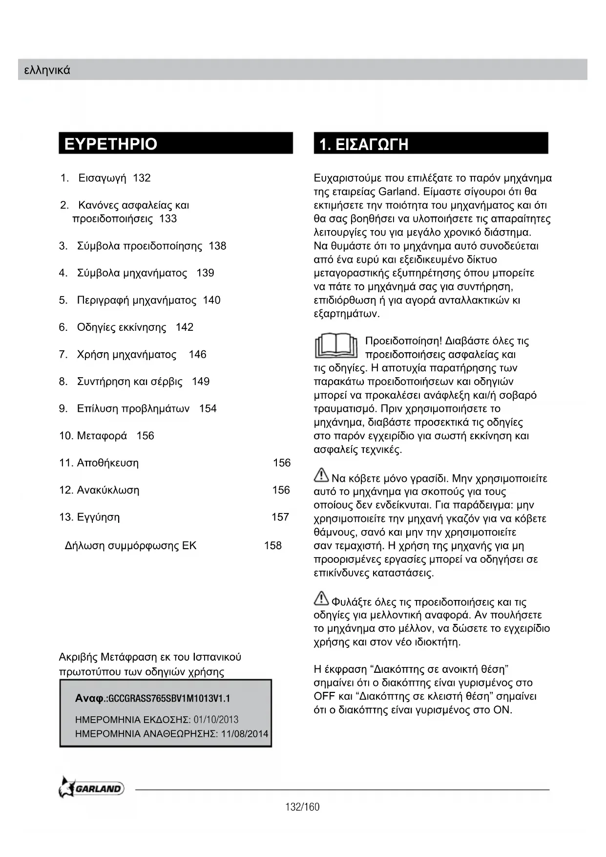 Ευχαριστούμε που επιλέξατε το παρόν μηχάνημα της εταιρείας Garland. Είμαστε σίγουροι ότι θα εκτιμήσετε την ποιότητα του μηχανήματος και ότι θα σας βοηθήσει να υλοποιήσετε τις απαραίτητες λειτουργίες του για μεγάλο χρονικό διάστημα. Να θυμάστε ότι το μηχάνημα αυτό συνοδεύεται από ένα ευρύ και εξειδικευμένο δίκτυο μεταγοραστικής εξυπηρέτησης όπου μπορείτε να πάτε το μηχάνημά σας για συντήρηση, επιδιόρθωση ή για αγορά ανταλλακτικών κι εξαρτημάτων. Προειδοποίηση! Διαβάστε όλες τις προειδοποιήσεις ασφαλείας και τις οδηγίες. Η αποτυχία παρατήρησης των παρακάτω προειδοποιήσεων και οδηγιών μπορεί να προκαλέσει ανάφλεξη και/ή σοβαρό τραυματισμό. Πριν χρησιμοποιήσετε το μηχάνημα, διαβάστε προσεκτικά τις οδηγίες στο παρόν εγχειρίδιο για σωστή εκκίνηση και ασφαλείς τεχνικές. Να κόβετε μόνο γρασίδι. Μην χρησιμοποιείτε αυτό το μηχάνημα για σκοπούς για τους οποίους δεν ενδείκνυται. Για παράδειγμα: μην χρησιμοποιείτε την μηχανή γκαζόν για να κόβετε θάμνους, σανό και μην την χρησιμοποιείτε σαν τεμαχιστή. Η χρήση της μηχανής για μη προορισμένες εργασίες μπορεί να οδηγήσει σε επικίνδυνες καταστάσεις. Φυλάξτε όλες τις προειδοποιήσεις και τις οδηγίες για μελλοντική αναφορά. Αν πουλήσετε το μηχάνημα στο μέλλον, να δώσετε το εγχειρίδιο χρήσης και στον νέο ιδιοκτήτη. Η έκφραση “Διακόπτης σε ανοικτή θέση” σημαίνει ότι ο διακόπτης είναι γυρισμένος στο OFF και “Διακόπτης σε κλειστή θέση” σημαίνει ότι ο διακόπτης είναι γυρισμένος στο ON. Ακριβής Μετάφραση εκ του Ισπανικού πρωτοτύπου των οδηγιών χρήσης
