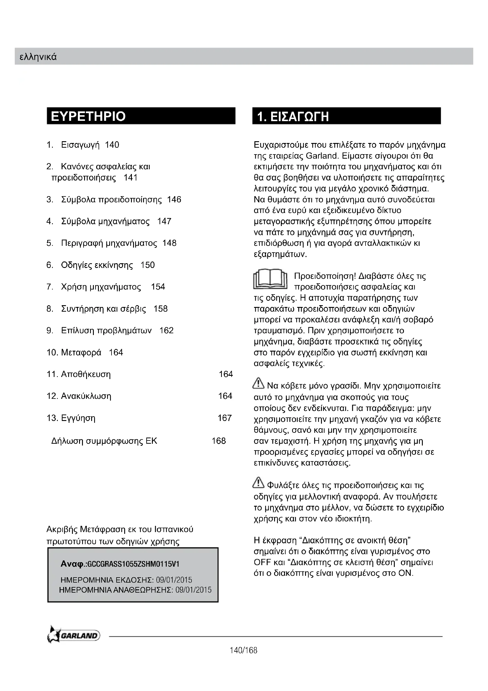 Ευχαριστούμε που επιλέξατε το παρόν μηχάνημα της εταιρείας Garland. Είμαστε σίγουροι ότι θα εκτιμήσετε την ποιότητα του μηχανήματος και ότι θα σας βοηθήσει να υλοποιήσετε τις απαραίτητες λειτουργίες του για μεγάλο χρονικό διάστημα. Να θυμάστε ότι το μηχάνημα αυτό συνοδεύεται από ένα ευρύ και εξειδικευμένο δίκτυο μεταγοραστικής εξυπηρέτησης όπου μπορείτε να πάτε το μηχάνημά σας για συντήρηση, επιδιόρθωση ή για αγορά ανταλλακτικών κι εξαρτημάτων.