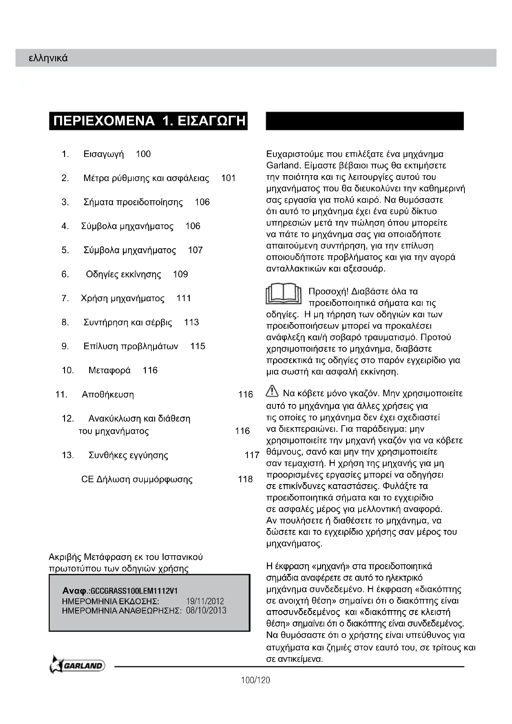 Κατεβάστε τις οδηγίες για το χλοοκοπτικό σε μορφή PDF δωρεάν! Βρείτε το εγχειρίδιό σας Grass 100 LE - GARLAND και πάρτε ξανά την ηλεκτρονική σας συσκευή στα χέρια σας. Σε αυτή τη σελίδα δημοσιεύονται όλα τα έγγραφα που απαιτούνται για τη χρήση της συσκευής σας. Grass 100 LE της μάρκας GARLAND.