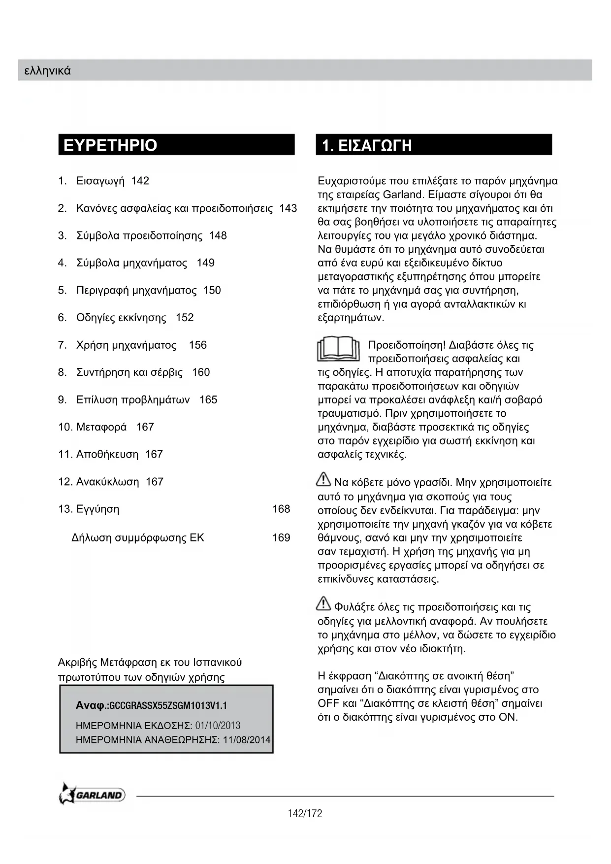 Κατεβάστε τις οδηγίες για το χλοοκοπτικό σε μορφή PDF δωρεάν! Βρείτε το εγχειρίδιό σας Grass 1055 ZSG - GARLAND και πάρτε ξανά την ηλεκτρονική σας συσκευή στα χέρια σας. Σε αυτή τη σελίδα δημοσιεύονται όλα τα έγγραφα που απαιτούνται για τη χρήση της συσκευής σας. Grass 1055 ZSG της μάρκας GARLAND.