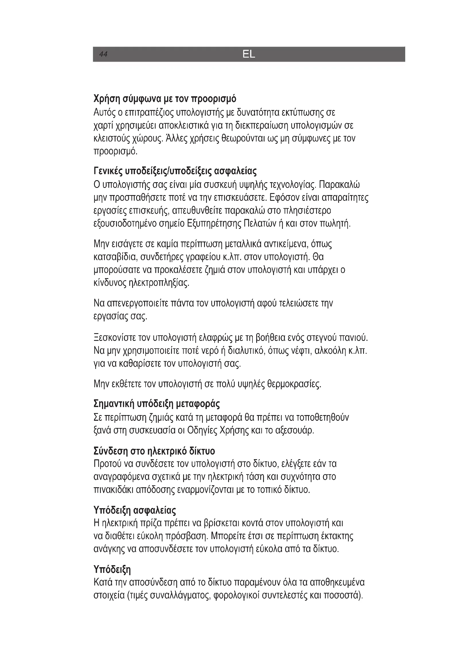 Γενικές υποδείξεις/υποδείξεις ασφαλείας Ο υπολογιστής σας είναι μία συσκευή υψηλής τεχνολογίας. Παρακαλώ μην προσπαθήσετε ποτέ να την επισκευάσετε. Εφόσον είναι απαραίτητες εργασίες επισκευής, απευθυνθείτε παρακαλώ στο πλησιέστερο εξουσιοδοτημένο σημείο Εξυπηρέτησης Πελατών ή και στον πωλητή. Μην εισάγετε σε καμία περίπτωση μεταλλικά αντικείμενα, όπως κατσαβίδια, συνδετήρες γραφείου κ.λπ. στον υπολογιστή. Θα μπορούσατε να προκαλέσετε ζημιά στον υπολογιστή και υπάρχει ο κίνδυνος ηλεκτροπληξίας. Να απενεργοποιείτε πάντα τον υπολογιστή αφού τελειώσετε την εργασίας σας. Ξεσκονίστε τον υπολογιστή ελαφρώς με τη βοήθεια ενός στεγνού πανιού. Να μην χρησιμοποιείτε ποτέ νερό ή διαλυτικό, όπως νέφτι, αλκοόλη κ.λπ. για να καθαρίσετε τον υπολογιστή σας. Μην εκθέτετε τον υπολογιστή σε πολύ υψηλές θερμοκρασίες. Σημαντική υπόδειξη μεταφοράς Σε περίπτωση ζημιάς κατά τη μεταφορά θα πρέπει να τοποθετηθούν ξανά στη συσκευασία οι Οδηγίες Χρήσης και το αξεσουάρ. Σύνδεση στο ηλεκτρικό δίκτυο Προτού να συνδέσετε τον υπολογιστή στο δίκτυο, ελέγξετε εάν τα αναγραφόμενα σχετικά με την ηλεκτρική τάση και συχνότητα στο πινακιδάκι απόδοσης εναρμονίζονται με το τοπικό δίκτυο. Υπόδειξη ασφαλείας Η ηλεκτρική πρίζα πρέπει να βρίσκεται κοντά στον υπολογιστή και να διαθέτει εύκολη πρόσβαση. Μπορείτε έτσι σε περίπτωση έκτακτης ανάγκης να αποσυνδέσετε τον υπολογιστή εύκολα από τα δίκτυο.