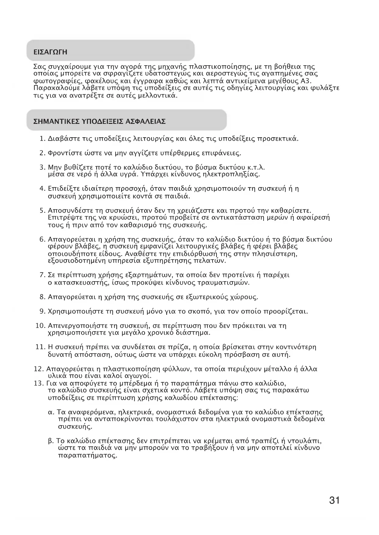 Σας συγχαίρουµε για την αγορά της µηχανής πλαστικοποίησης, µε τη βοήθεια της οποίας µπορείτε να σφραγίζετε υδατοστεγώς και αεροστεγώς τις αγαπηµένες σας φωτογραφίες, φακέλους και έγγραφα καθώς και λεπτά αντικείµενα µεγέθους Α3. Παρακαλούµε λάβετε υπόψη τις υποδείξεις σε αυτές τις οδηγίες λειτουργίας και φυλάξτε τις για να ανατρέξτε σε αυτές µελλοντικά. ΣΗΜΑΝΤΙΚΕΣ ΥΠΟΔΕΙΞΕΙΣ ΑΣΦΑΛΕΙΑΣ