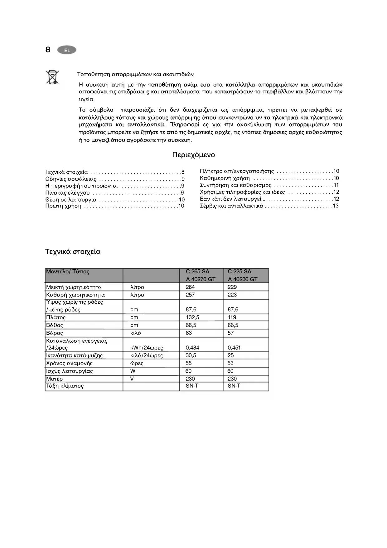 Μεικτή χωρητικότητα λίτρο 264 229 Καθαρή χωρητικότητα λίτρο 257 223 Ύψος χωρίς τις ρόδες /µε τις ρόδες cm 87,6 87,6 Πλάτος cm 132,5 119 Βάθος cm 66,5 66,5 Βάρος κιλά 63 57 Κατανάλωση ενέργειας /24ώρες kWh/24ώρες 0,484 0,451 Ικανότητα κατάψυξης κιλά/24ώρες 30,5 25 Χρόνος αναµονής ώρες 55 53 Ισχύς λειτουργίας W 60 60 Μοτέρ V 230 230 Τάξη κλίµατος SN-T SN-T EL9 ΟΟδδηηγγίίεεςς αασσφφάάλλεειιααςς Πριν από την εγκατάστασ η και χρήση της συσκευής διαβάστε προσεχτικά το εγχειρίδιο οδηγιών του χ ρήστη. Περιλαµβάνει οδηγίες ασφάλειας, συµβουλές, πληροφορίες και ιδέες . Εάν ο καταψύκτης χρησιµοποιείται σύµφωνα µε τις οδηγίες του εγχειριδίο υ, θα λειτουργεί κανονικά και θα σας παρέχει µεγαλύτερη ικανοποίηση. Προειδοποιήσεις που αφορούν την προσωπική σας ασφάλεια. Πριν από την εγκ ατάσταση και χρήση της συσκευής διαβάστε τις προσεχτικά. Χρησιµοποιείστε τον καταψύκτη µόνο για αποθήκευση καταψυγµένων τροφί µων, κατάψυξη φρέσκων τροφίµων και για να φτιάξετε