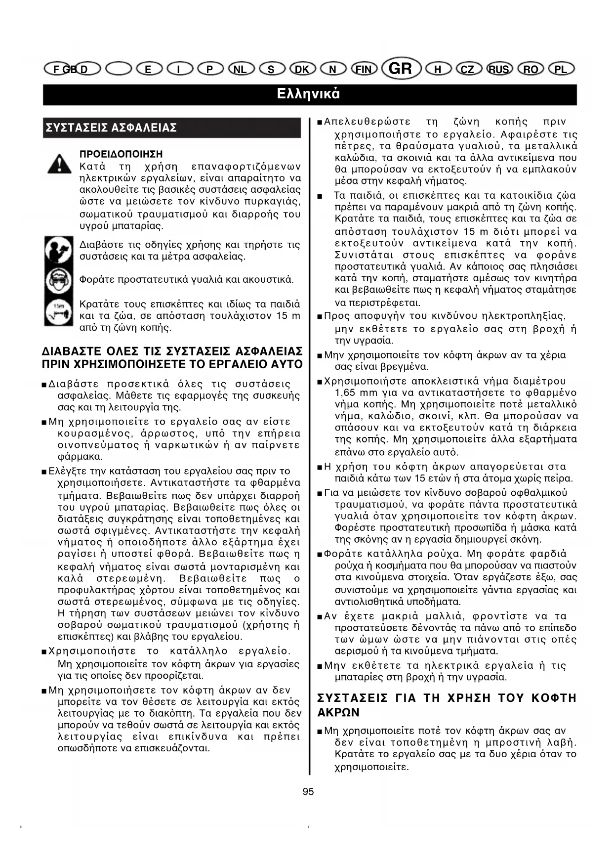 FIN F GB D Suomi E I P NL S DK N GR H CZ RUS RO PL CLT-1423P / 1823 P manual 24/11/04 11:57 Page 94ΣΥΣΤΑΣΕΙΣ ΑΣΦΑΛΕΙΑΣ ΠΡΟΕΙ∆ΟΠΟΙΗΣΗ Κατά τη χρήση επαναφορτιζµενων ηλεκτρικών εργαλείων, είναι απαραίτητο να ακολουθείτε τις βασικές συστάσεις ασφαλείας ώστε να µειώσετε τον κίνδυνο πυρκαγιάς, σωµατικού τραυµατισµού και διαρροής του υγρού µπαταρίας. ∆ιαβάστε τις οδηγίες χρήσης και τηρήστε τις συστάσεις και τα µέτρα ασφαλείας. Φοράτε προστατευτικά γυαλιά και ακουστικά. Κρατάτε τους επισκέπτες και ιδίως τα παιδιά και τα ζώα, σε απσταση τουλάχιστον 15 m απ τη ζώνη κοπής. ∆ΙΑΒΑΣΤΕ ΟΛΕΣ ΤΙΣ ΣΥΣΤΑΣΕΙΣ ΑΣΦΑΛΕΙΑΣ ΠΡΙΝ ΧΡΗΣΙΜΟΠΟΙΗΣΕΤΕ ΤΟ ΕΡΓΑΛΕΙΟ ΑΥΤΟ ■ ∆ιαβάστε προσεκτικά λες τις συστάσεις ασφαλείας. Μάθετε τις εφαρµογές της συσκευής σας και τη λειτουργία της. ■ Μη χρησιµοποιείτε το εργαλείο σας αν είστε κουρασµένος, άρρωστος, υπ την επήρεια οινοπνεύµατος ή ναρκωτικών ή αν παίρνετε