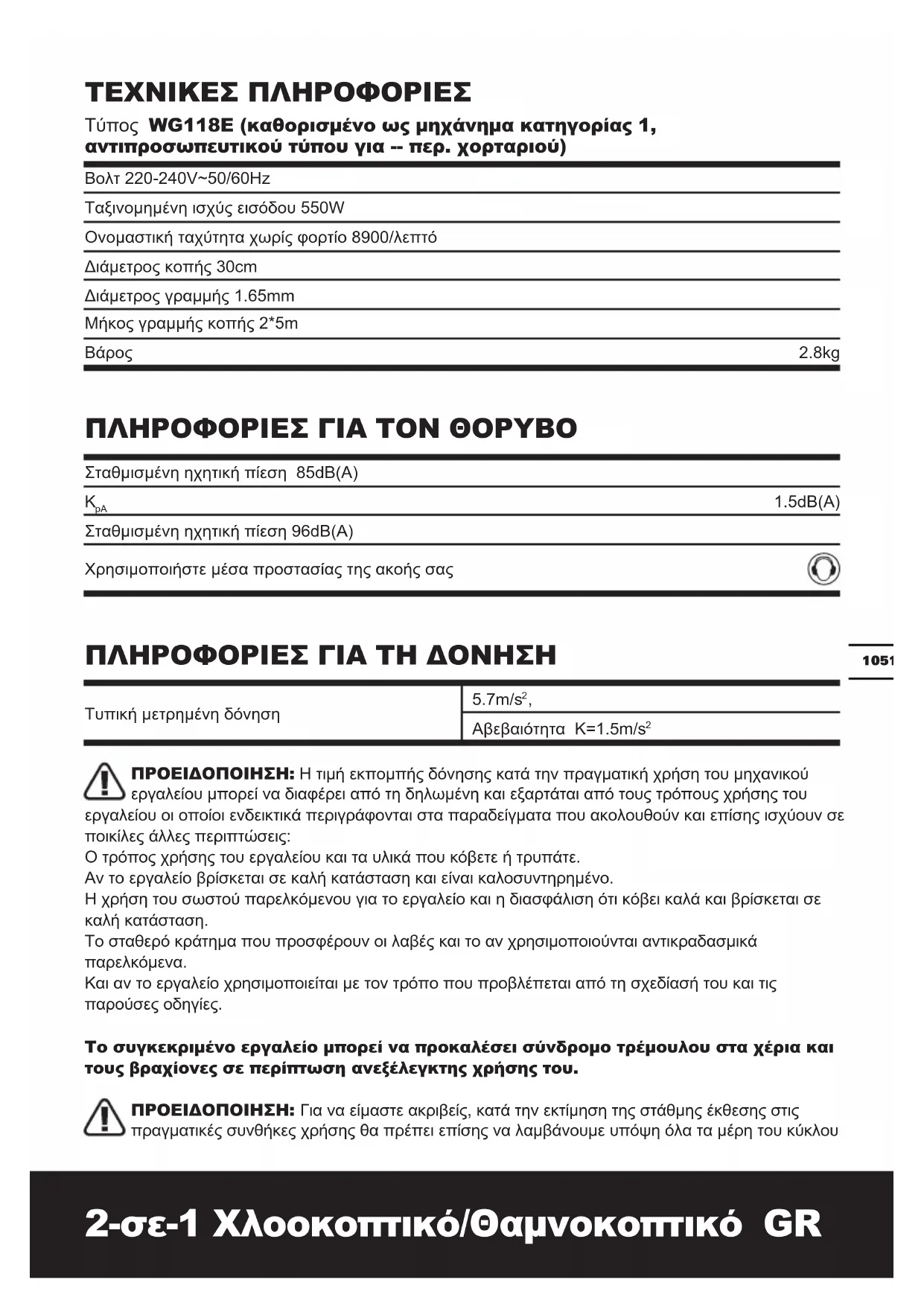 1.5dB(A) Σταθμισμένη ηχητική πίεση 96dB(A) Χρησιμοποιήστε μέσα προστασίας της ακοής σας