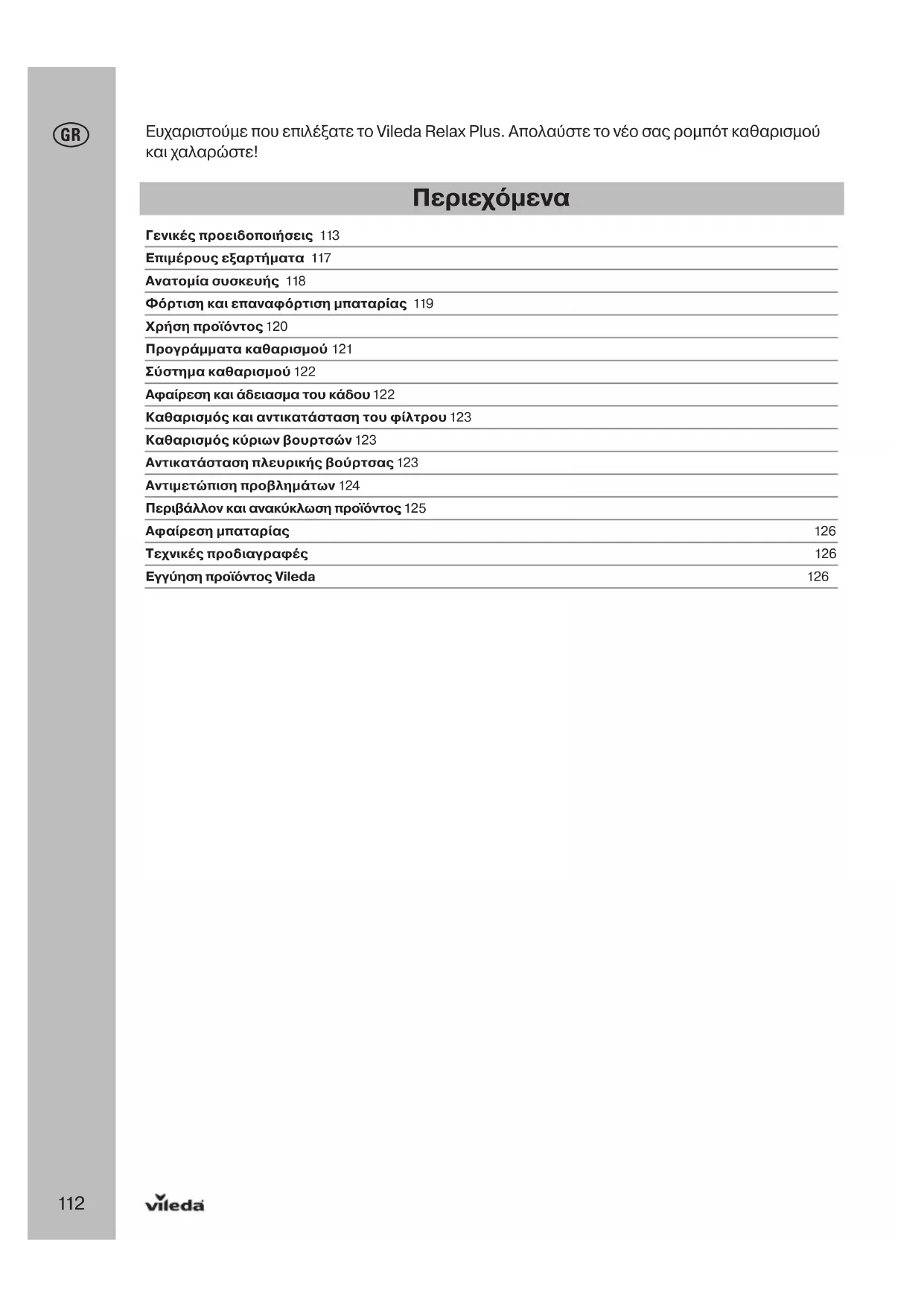 Ευχαριστούμε που επιλέξατε το Vileda Relax Plus. Απολαύστε το νέο σας ρομπότ καθαρισμού και χαλαρώστε! Περιεχόμενα Γενικές προειδοποιήσεις 113 Επιμέρους εξαρτήματα 117 Ανατομία συσκευής 118 Φόρτιση και επαναφόρτιση μπαταρίας 119 Χρήση προϊόντος 12 0 Προγράμματα καθαρισμού 121 Σύστημα καθαρισμού 12 2 Αφαίρεση και άδειασμα του κάδου 12 2 Καθαρισμός και αντικατάσταση του φίλτρου 12 3 Καθαρισμός κύριων βουρτσών 12 3 Αντικατάσταση πλευρικής βούρτσας 12 3 Αντιμετώπιση προβλημάτων 124 Περιβάλλον και ανακύκλωση προϊόντος 12 5 Αφαίρεση μπαταρίας 12 6 Τεχνικές προδιαγραφές 12 6 Εγγύηση προϊόντος Vileda 12 6113