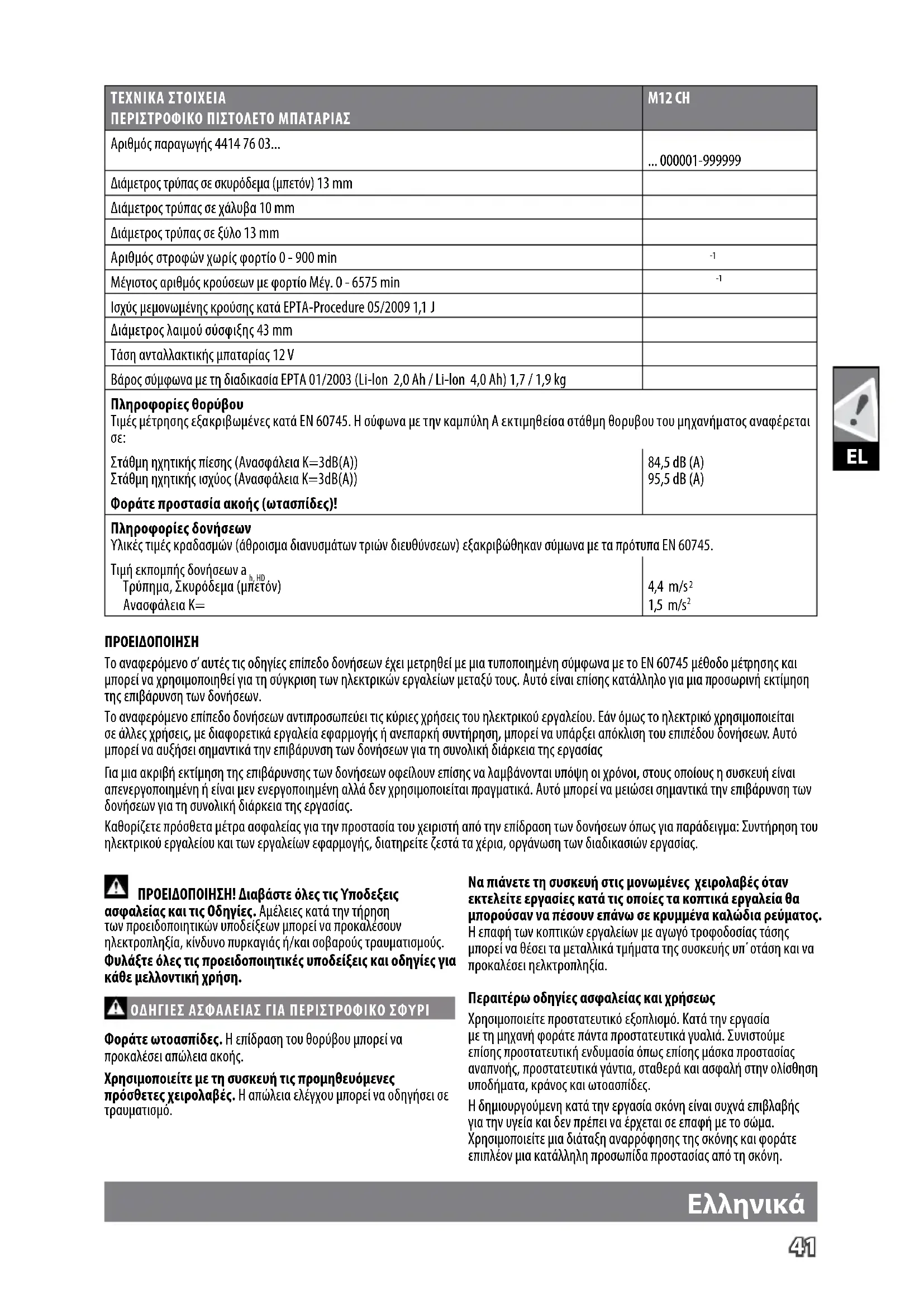 ΠΡΟEIΔΟΠΟIΗΣΗ! Διαβάστε όλες τις Υποδεξεις ασφαλείας και τις Οδηγίες. Αμέλειες κατά την τήρηση των προειδοποιητικών υποδείξεων μπορεί να προκαλέσουν ηλεκτροπληξία, κίνδυνο πυρκαγιάς ή/και σοβαρούς τραυματισμούς. Φυλάξτε όλες τις προειδοποιητικές υποδείξεις και οδηγίες για κάθε μελλοντική χρήση. ΟΔΗΓΊΕΣ ΑΣΦΑΛΕΊΑΣ ΓΊΑ ΠΕΡΊΣΤΡΟΦΊΚΟ ΣΦΥΡΊ Φοράτε ωτοασπίδες. Η επίδραση του θορύβου μπορεί να προκαλέσει απώλεια ακοής. Χρησιμοποιείτε με τη συσκευή τις προμηθευόμενες πρόσθετες χειρολαβές. Η απώλεια ελέγχου μπορεί να οδηγήσει σε τραυματισμό. Να πιάνετε τη συσκευή στις μονωμένες χειρολαβές όταν εκτελείτε εργασίες κατά τις οποίες τα κοπτικά εργαλεία θα μπορούσαν να πέσουν επάνω σε κρυμμένα καλώδια ρεύματος. Η επαφή των κοπτικών εργαλείων με αγωγό τροφοδοσίας τάσης μπορεί να θέσει τα μεταλλικά τμήματα της συσκευής υπ΄οτάση και να προκαλέσει ηελκτροπληξία. Περαιτέρω οδηγίες ασφαλείας και χρήσεως Χρησιμοποιείτε προστατευτικό εξοπλισμό. Κατά την εργασία με τη μηχανή φοράτε πάντα προστατευτικά γυαλιά. Συνιστούμε επίσης προστατευτική ενδυμασία όπως επίσης μάσκα προστασίας αναπνοής, προστατευτικά γάντια, σταθερά και ασφαλή στην ολίσθηση υποδήματα, κράνος και ωτοασπίδες. Η δημιουργούμενη κατά την εργασία σκόνη είναι συχνά επιβλαβής για την υγεία και δεν πρέπει να έρχεται σε επαφή με το σώμα. Χρησιμοποιείτε μια διάταξη αναρρόφησης της σκόνης και φοράτε επιπλέον μια κατάλληλη προσωπίδα προστασίας από τη σκόνη. ΤΕΧΝΊΚΑ ΣΤΟΊΧΕΊΑ ΠΕΡΊΣΤΡΟΦΊΚΟ ΠΊΣΤΟΛΕΤΟ ΜΠΑΤΑΡΊΑΣ M12 CH Αριθμός παραγωγής 4414 76 03... ... 000001-999999 Διάμετρος τρύπας σε σκυρόδεμα (μπετόν) 13 mm Διάμετρος τρύπας σε χάλυβα 10 mm Διάμετρος τρύπας σε ξύλο 13 mm Αριθμός στροφών χωρίς φορτίο 0 - 900 min