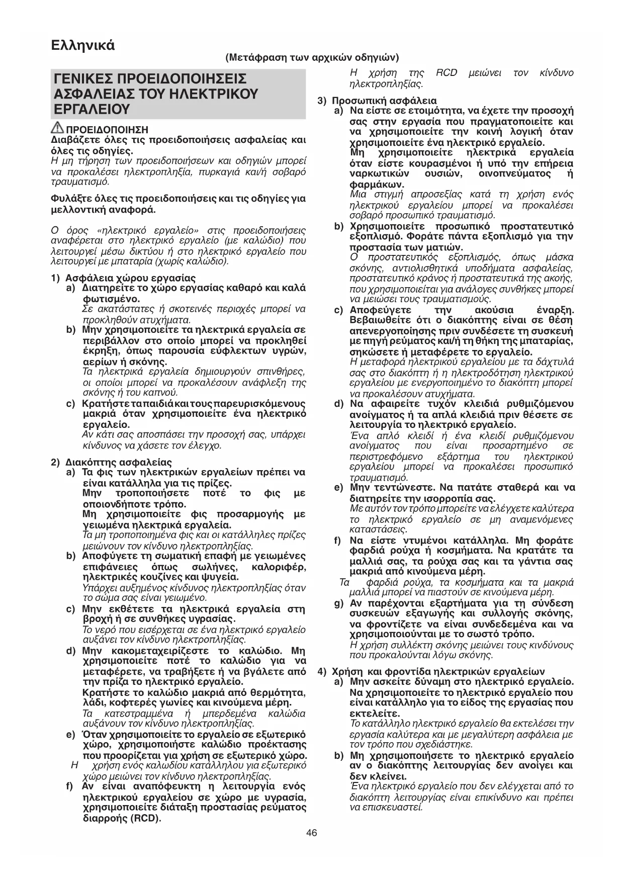 ΠΡΟΕΙΔΟΠΟΙΗΣΗ Διαβάζετε όλες τις προειδοποιήσεις ασφαλείας και όλες τις οδηγίες. Η μη τήρηση των προειδοποιήσεων και οδηγιών μπορεί να προκαλέσει ηλεκτροπληξία, πυρκαγιά και/ή σοβαρό τραυματισμό. Φυλάξτε όλες τις προειδοποιήσεις και τις οδηγίες για μελλοντική αναφορά. Ο όρος «ηλεκτρικό εργαλείο» στις προειδοποιήσεις αναφέρεται στο ηλεκτρικό εργαλείο (με καλώδιο) που λειτουργεί μέσω δικτύου ή στο ηλεκτρικό εργαλείο που λειτουργεί με μπαταρία (χωρίς καλώδιο).
