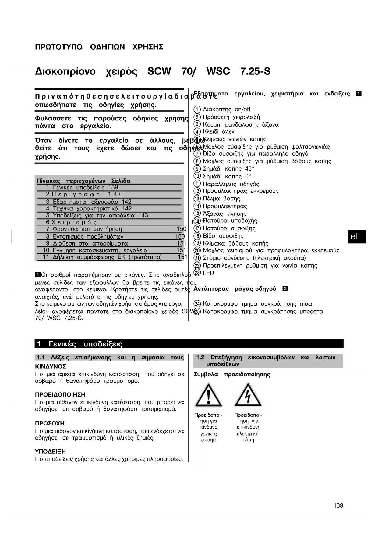 Πίνακας περιεχομένων Σελίδα1 Γενικές υποδείξεις 1392Περιγραφή 1403 Εξαρτήματα, αξεσουάρ 1424 Τεχνικά χαρακτηριστικά 1425 Υποδείξεις για την ασφάλεια 1436Χειρισμός 1477 Φροντίδα και συντήρηση 1508 Εντοπισμός προβλημάτων 1509 Διάθεση στα απορρίμματα 15110 Εγγύηση κατασκευαστή, εργαλεία 15111 Δήλωση συμμόρφωσης ΕΚ (πρωτότυπο) 1511 Οι αριθμοί παραπέμπουν σε εικόνες. Στις αναδιπλού-μενες σελίδες των εξώφυλλων θα βρείτε τις εικόνες πουαναφέρονται στο κείμενο. Κρατήστε τις σελίδες αυτέςανοιχτές, ενώ μελετάτε τις οδηγίες χρήσης. Στο κείμενο αυτών των οδηγιών χρήσης ο όρος «το εργα- λείο» αναφέρεται πάντοτε στο δισκοπρίονο χειρός SCW70/ WSC 7.25-S.Εξαρτήματα εργαλείου, χειριστήρια και ενδείξεις 1 Διακόπτης on/off Πρόσθετη χειρολαβή Κουμπί μανδάλωσης άξονα Κλειδί άλεν Κλίμακα γωνιών κοπής Μοχλός σύσφιξης για ρύθμιση φαλτσογωνιάς Βίδα σύσφιξης για παράλληλο οδηγό Μοχλός σύσφιξης για ρύθμιση βάθους κοπής Σημάδι κοπής 45° Σημάδι κοπής 0° Παράλληλος οδηγός Προφυλακτήρας εκκρεμούς Πέλμα βάσης Προφυλακτήρας Άξονας κίνησης Πατούρα υποδοχής Πατούρα σύσφιξης Βίδα σύσφιξης Κλίμακα βάθους κοπής Μοχλός χειρισμού για προφυλακτήρα εκκρεμούς Στόμιο σύνδεσης (ηλεκτρική σκούπα) Προεπιλεγμένη ρύθμιση για γωνία κοπής