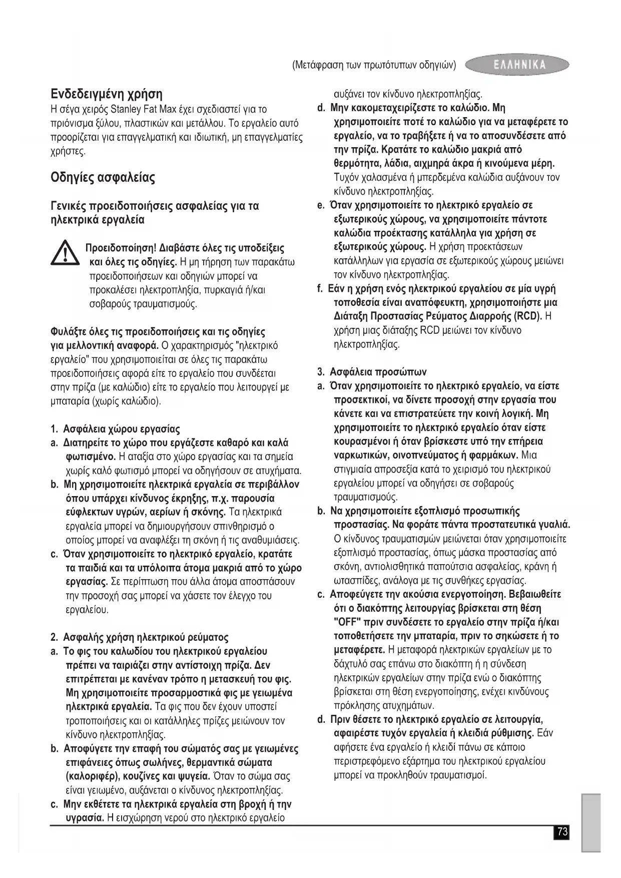Προειδοποίηση! Για να μειωθεί ο κίνδυνος τραυματισμού, ο χρήστης πρέπει να διαβάσει το εγχειρίδιο οδηγιών. Ασφαλής χρήση ηλεκτρικού ρεύματος