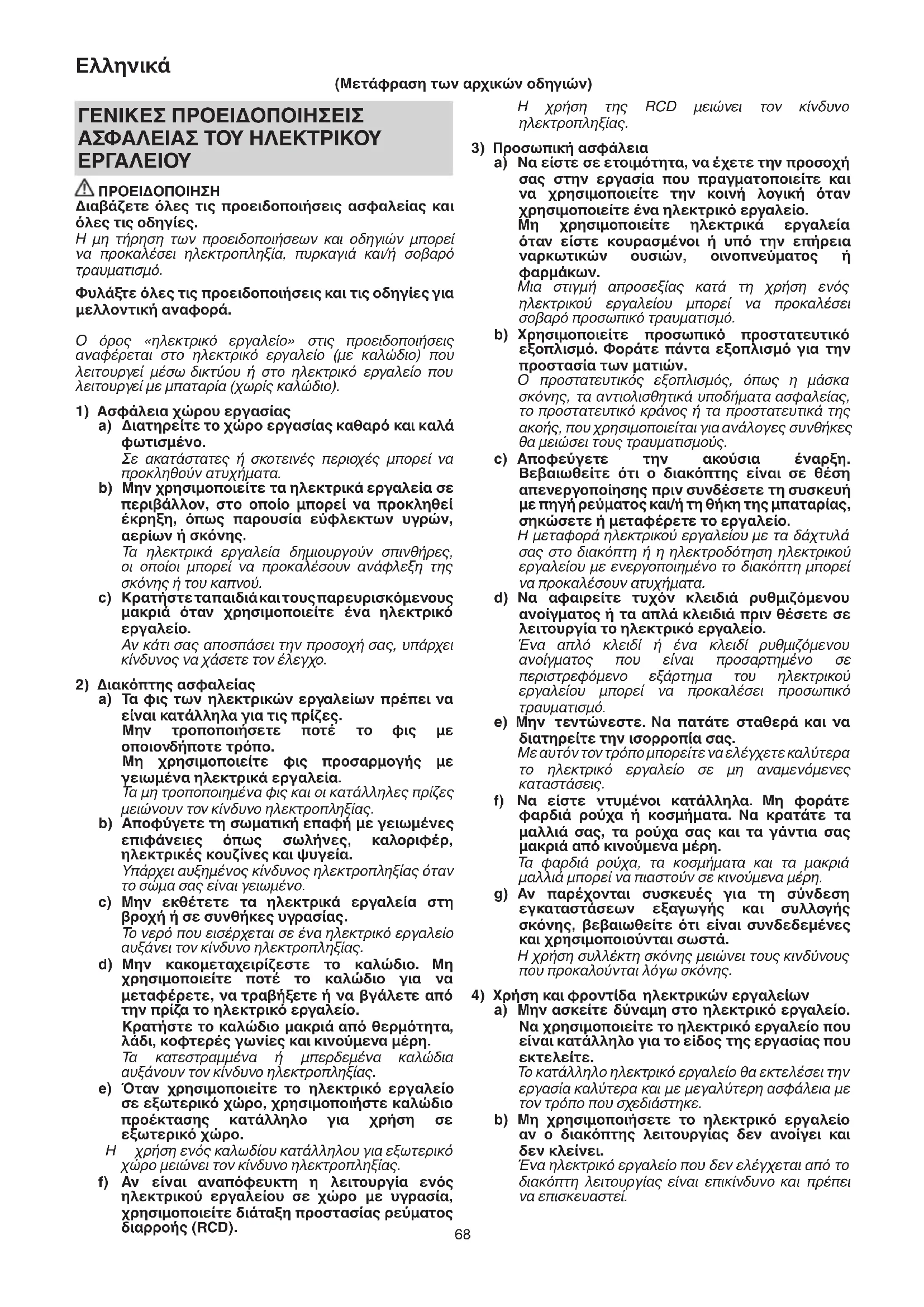 ΠΡΟΕΙΔΟΠΟΙΗΣΗ Διαβάζετε όλες τις προειδοποιήσεις ασφαλείας και όλες τις οδηγίες. Η μη τήρηση των προειδοποιήσεων και οδηγιών μπορεί να προκαλέσει ηλεκτροπληξία, πυρκαγιά και/ή σοβαρό τραυματισμό. Φυλάξτε όλες τις προειδοποιήσεις και τις οδηγίες για μελλοντική αναφορά. Ο όρος «ηλεκτρικό εργαλείο» στις προειδοποιήσεις αναφέρεται στο ηλεκτρικό εργαλείο (με καλώδιο) που λειτουργεί μέσω δικτύου ή στο ηλεκτρικό εργαλείο που λειτουργεί με μπαταρία (χωρίς καλώδιο).