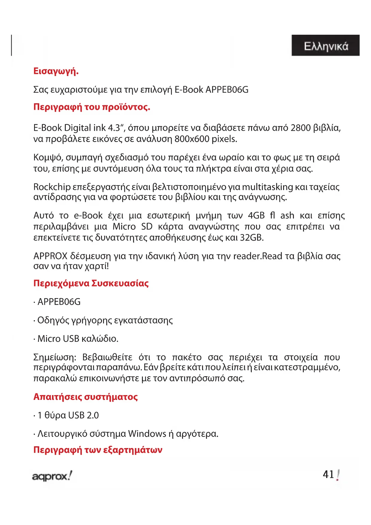Κατεβάστε τις οδηγίες για το ηλεκτρονικός αναγνώστης σε μορφή PDF δωρεάν! Βρείτε το εγχειρίδιό σας APPEB06G - Approx και πάρτε ξανά την ηλεκτρονική σας συσκευή στα χέρια σας. Σε αυτή τη σελίδα δημοσιεύονται όλα τα έγγραφα που απαιτούνται για τη χρήση της συσκευής σας. APPEB06G της μάρκας Approx.