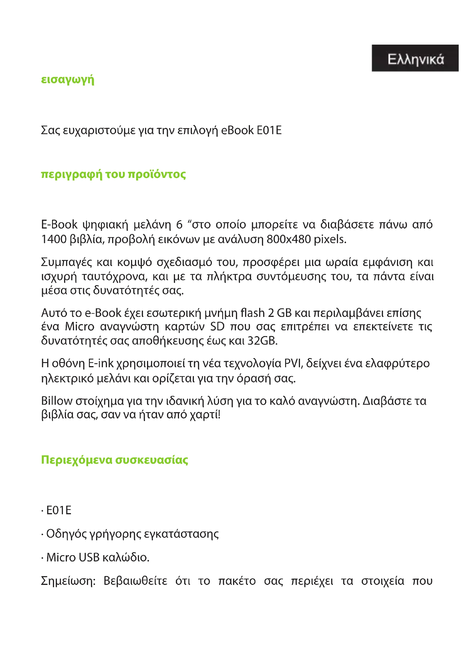 - Drücken Sie die Menü-Taste, um das Optionsmenü zu verwenden. Unterstützung Bitte für weitere Informationen zur Installation und Konguration dieses Produkt gehen zu unserer Web billowtechnology.com Support-Bereich und laden Sie die komplette Anleitung oder schreiben Sie eine E-Mail an die folgende Adresse: support@billowtechnology.comεισαγωγή Σας ευχαριστούμε για την επιλογή eBook E01E περιγραφή του προϊόντος E-Book ψηφιακή μελάνη 6 “στο οποίο μπορείτε να διαβάσετε πάνω από 1400 βιβλία, προβολή εικόνων με ανάλυση 800x480 pixels. Συμπαγές και κομψό σχεδιασμό του, προσφέρει μια ωραία εμφάνιση και ισχυρή ταυτόχρονα, και με τα πλήκτρα συντόμευσης του, τα πάντα είναι μέσα στις δυνατότητές σας. Αυτό το e-Book έχει εσωτερική μνήμη ash 2 GB και περιλαμβάνει επίσης ένα Micro αναγνώστη καρτών SD που σας επιτρέπει να επεκτείνετε τις δυνατότητές σας αποθήκευσης έως και 32GB. Η οθόνη E-ink χρησιμοποιεί τη νέα τεχνολογία PVI, δείχνει ένα ελαφρύτερο ηλεκτρικό μελάνι και ορίζεται για την όρασή σας. Billow στοίχημα για την ιδανική λύση για το καλό αναγνώστη. Διαβάστε τα βιβλία σας, σαν να ήταν από χαρτί! Περιεχόμενα συσκευασίας