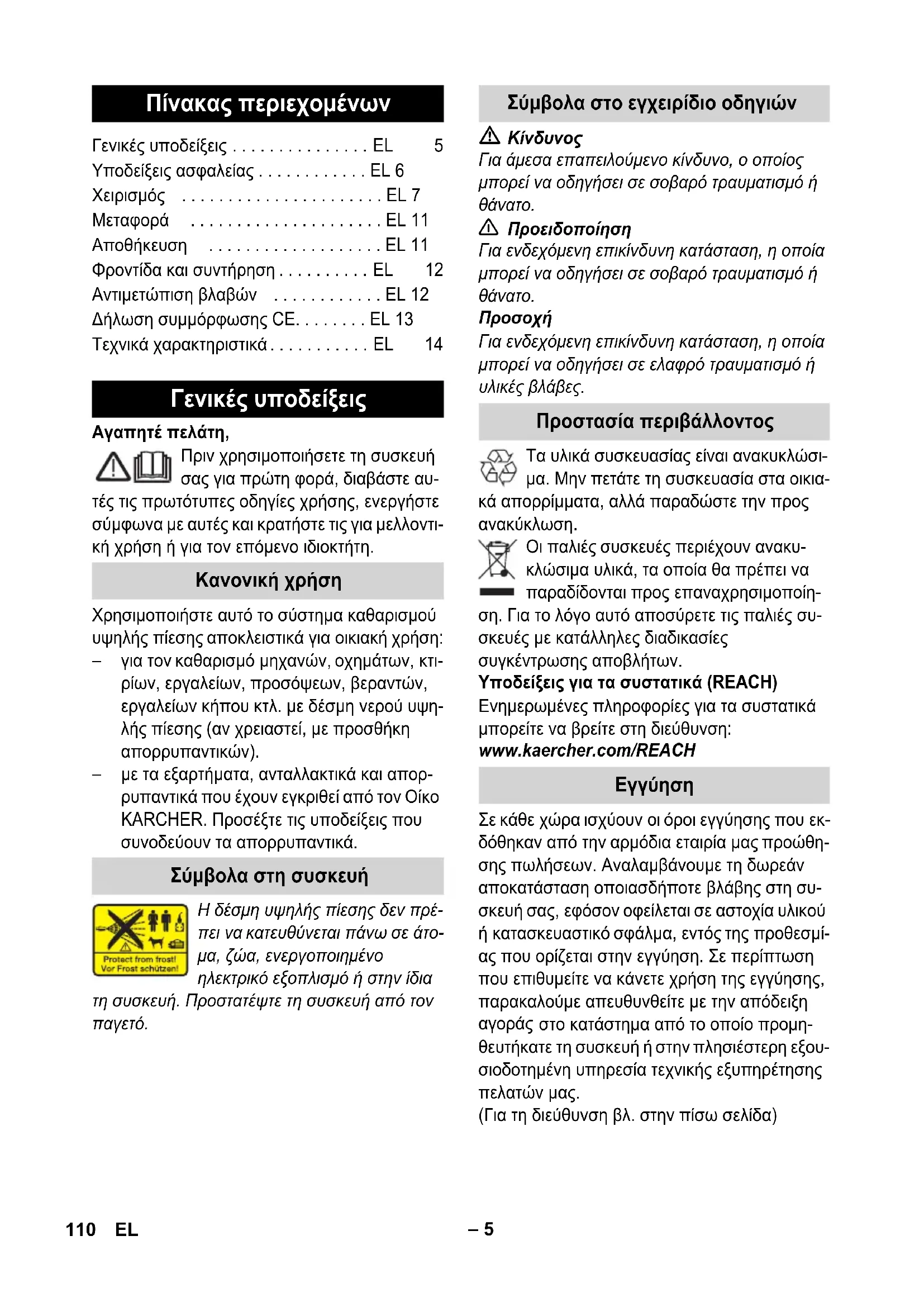 Εάν λείπουν εξαρτήματα ή έχουν προκληθεί ζη μιές κατά τη μεταφορά, παρακαλούμε ενημερώ- στε τον προμηθευτή σας. Αυτές οι οδηγίες λειτουργίας περιγράφουν τα βασικά μοντέλα του συστήματος καθαρισμού υψηλής πίεσης που απεικονίζεται στο εξώφυλ