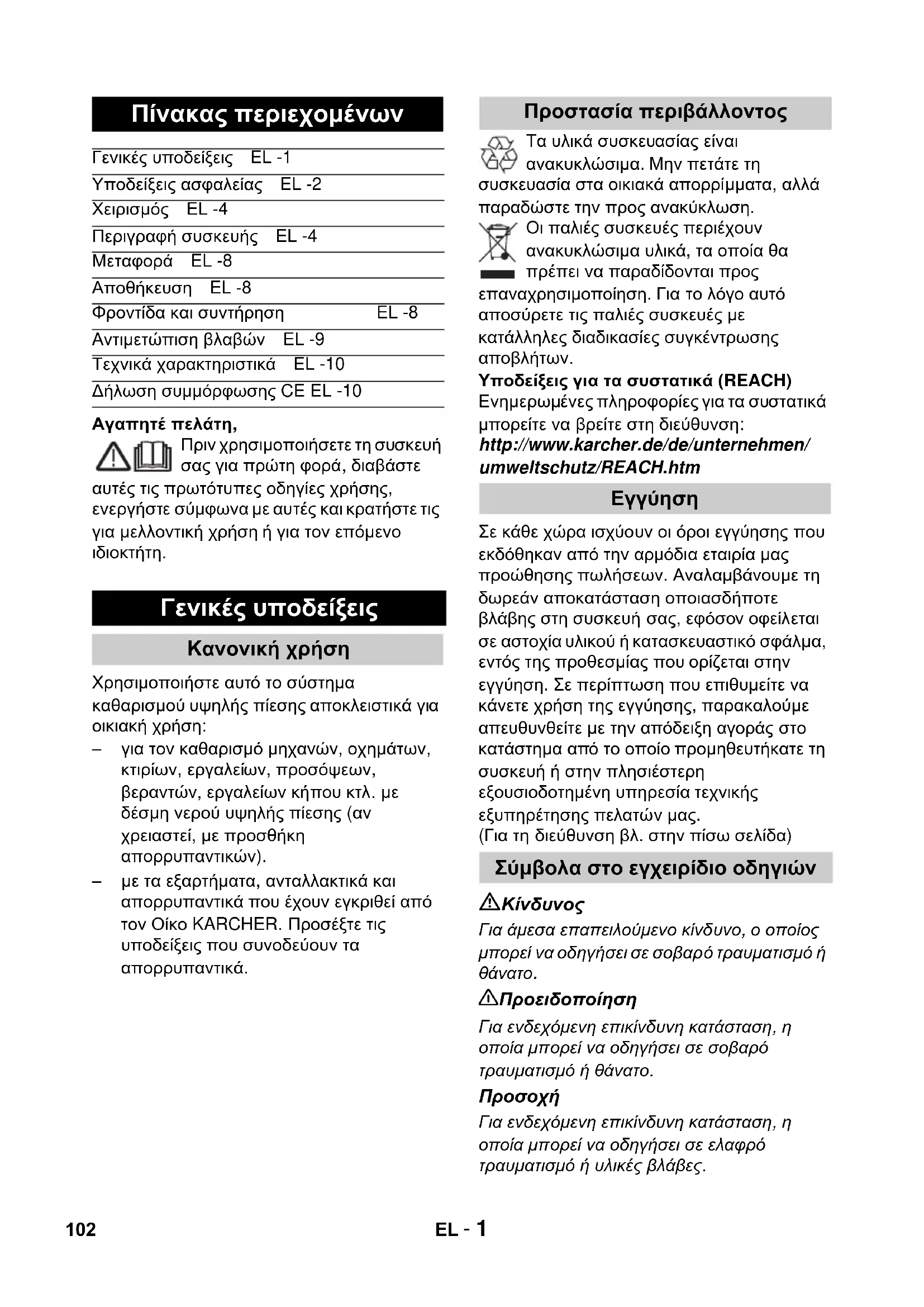 Για ενδεχόμενη επικίνδυνη κατάσταση, η οποία μπορεί να οδηγήσει σε ελαφρό τραυματισμό ή υλικές βλάβες. Πίνακας περιεχομένων Γενικές υποδείξεις EL -1 Υποδείξεις ασφαλείας EL -2 Χειρισμός EL -4 Περιγραφή συσκευής EL -4 Μεταφορά EL -8 Αποθήκευση EL -8 Φροντίδα και συντήρηση EL -8 Αντιμετώπιση βλαβών EL -9 Τεχνικά χαρακτηριστικά EL -10 Δήλωση συμμόρφωσης CE EL -10 Γενικές υποδείξεις Κανονική χρήση Προστασία περιβάλλοντος