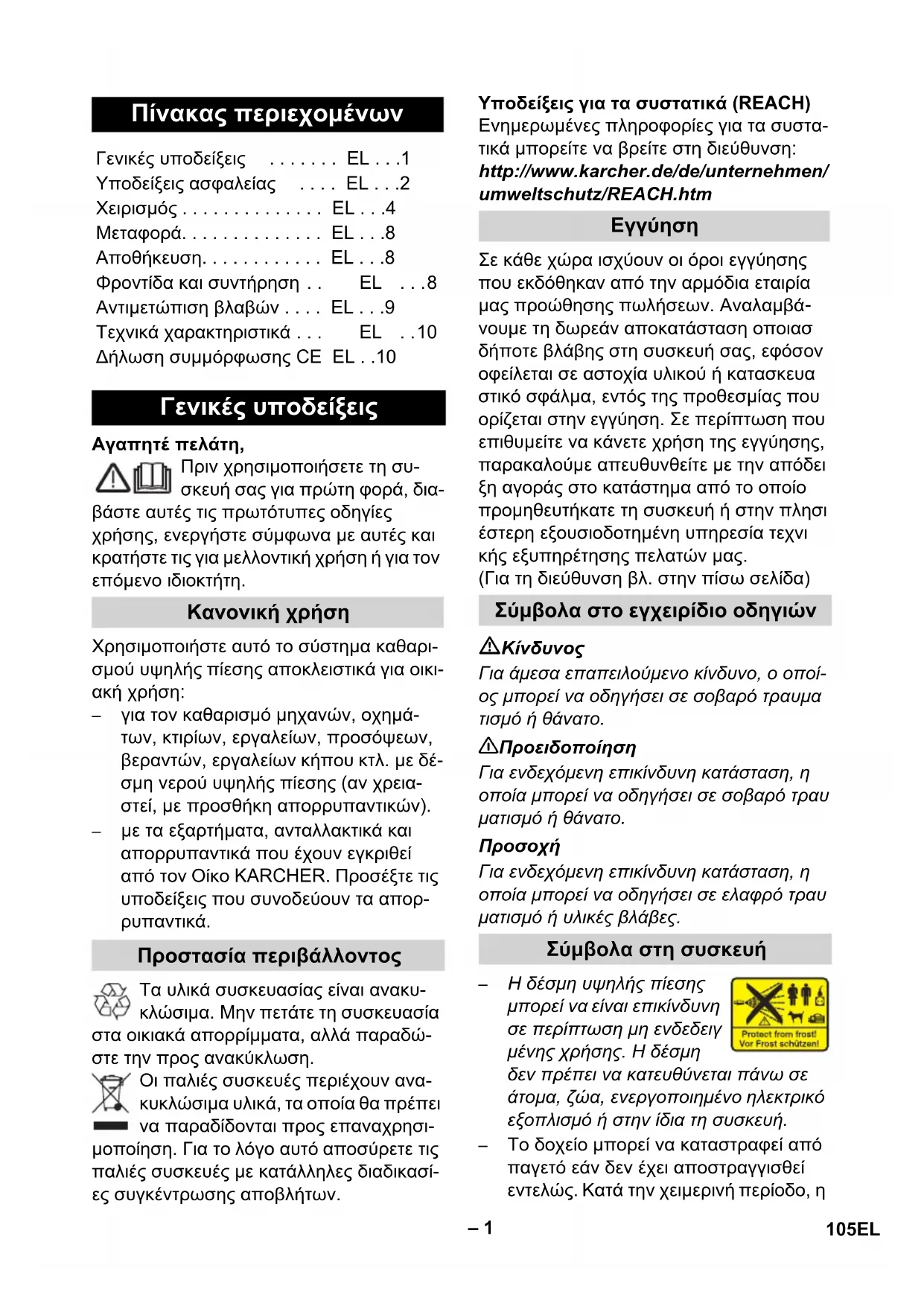 - Για ενδεχόμενη επικίνδυνη κατάσταση, η οποία μπορεί να οδηγήσει σε ελαφρό τραυ ματισμό ή υλικές βλάβες. – Η δέσμη υψηλής πίεσης μπορεί να είναι επικίνδυνη σε περίπτωση μη ενδεδειγ μένης χρήσης. Η δέσμη δεν πρέπει να κατευθύνεται πάνω σε άτομα, ζώα, ενεργοποιημένο ηλεκτρικό εξοπλισμό ή στην ίδια τη συσκευή. – Το δοχείο μπορεί να καταστραφεί από παγετό εάν δεν έχει αποστραγγισθεί εντελώς. Κατά την χειμερινή περίοδο, η Πίνακας περιεχομένων Γενικές υποδείξεις