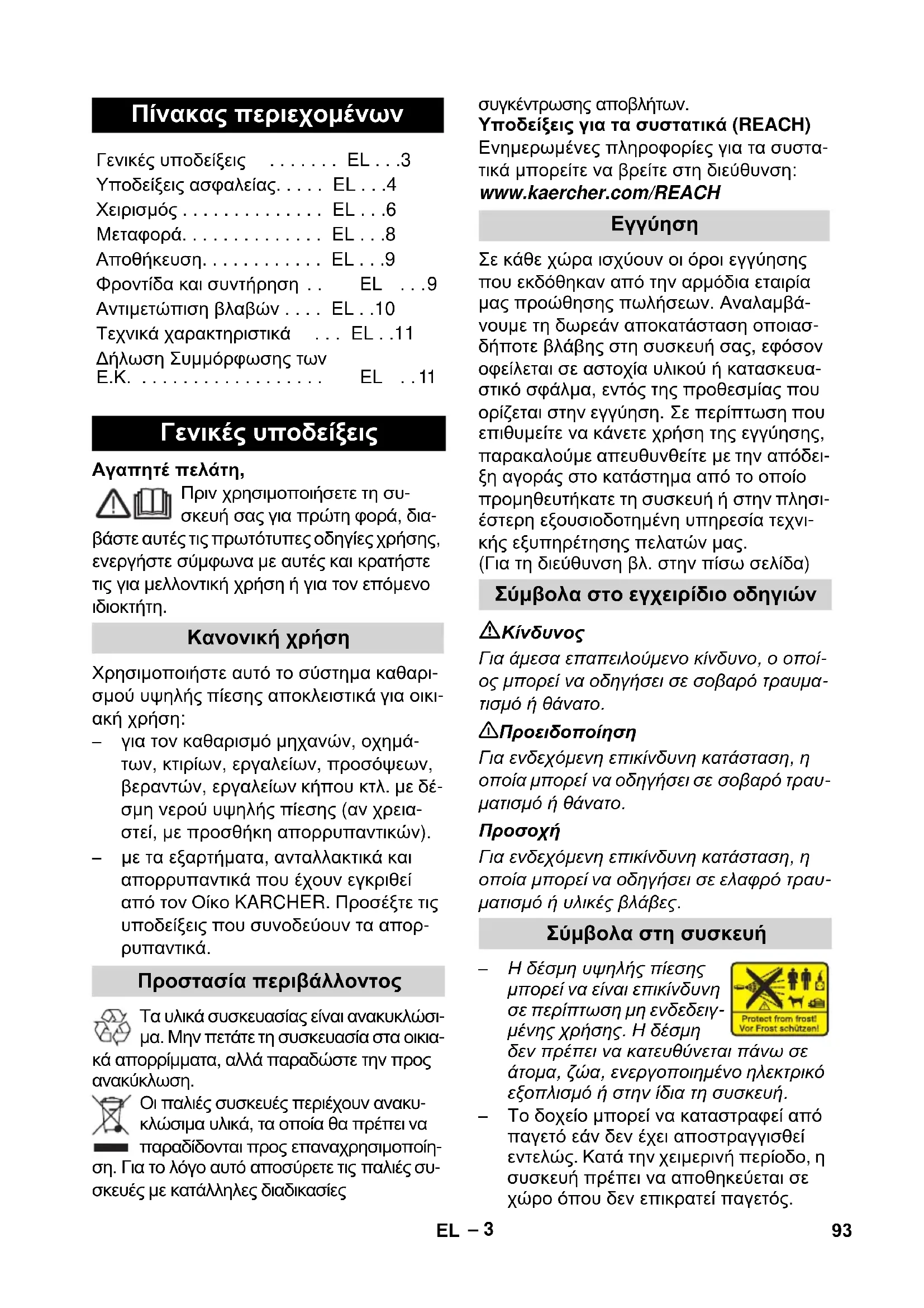 Για ενδεχόμενη επικίνδυνη κατάσταση, η οποία μπορεί να οδηγήσει σε ελαφρό τραυ- ματισμό ή υλικές βλάβες. – Η δέσμη υψηλής πίεσης μπορεί να είναι επικίνδυνη σε περίπτωση μη ενδεδειγ- μένης χρήσης. Η δέσμη δεν πρέπει να κατευθύνεται πάνω σε άτομα, ζώα, ενεργοποιημένο ηλεκτρικό εξοπλισμό ή στην ίδια τη συσκευή. – Το δοχείο μπορεί να καταστραφεί από παγετό εάν δεν έχει αποστραγγισθεί εντελώς. Κατά την χειμερινή περίοδο, η συσκευή πρέπει να αποθηκεύεται σε χώρο όπου δεν επικρατεί παγετός. Πίνακας περιεχομένων Γενικές υποδείξεις . . . . . . . EL . . .3 Υποδείξεις ασφαλείας. . . . . EL . . .4 Χειρισμός . . . . . . . . . . . . . . EL . . .6 Μεταφορά. . . . . . . . . . . . . . EL . . .8 Αποθήκευση. . . . . . . . . . . . EL . . .9 Φροντίδα και συντήρηση . . EL . . .9 Αντιμετώπιση βλαβών . . . . EL . .10 Τεχνικά χαρακτηριστικά . . . EL . .11 Δήλωση Συμμόρφωσης των Ε.Κ. . . . . . . . . . . . . . . . . . . EL . .11 Γενικές υποδείξεις Κανονική χρήση Προστασία περιβάλλοντος