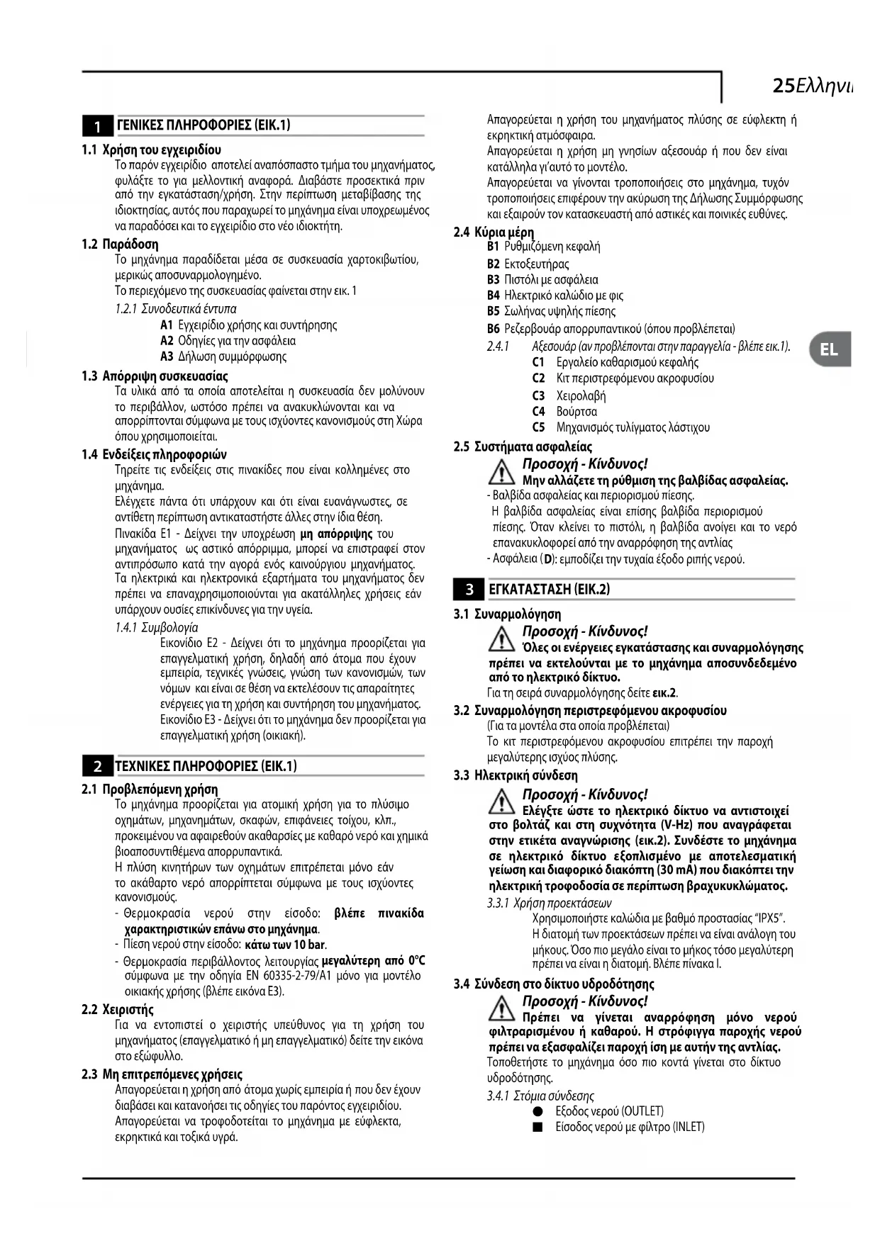 Το μηχάνημα προορίζεται για ατομική χρήση για το πλύσιμο οχημάτων, μηχανημάτων, σκαφών, επιφάνειες τοίχου, κλπ., προκειμένου να αφαιρεθούν ακαθαρσίες με καθαρό νερό και χημικά βιοαποσυντιθέμενα απορρυπαντικά. Η πλύση κινητήρων των οχημάτων επιτρέπεται μόνο εάν το ακάθαρτο νερό απορρίπτεται σύμφωνα με τους ισχύοντες κανονισμούς. - Θερμοκρασία νερού στην είσοδο: βλέπε πινακίδα χαρακτηριστικών επάνω στο ηχάνηα.- Πίεση νερού στην είσοδο: κάτω των 10 bar.- Θερμοκρασία περιβάλλοντος λειτουργίας εγαλύτερη από 0°C σύμφωνα με την οδηγία EN 60335-2-79/A1 μόνο για μοντέλο οικιακής χρήσης (βλέπε εικόνα Ε3).