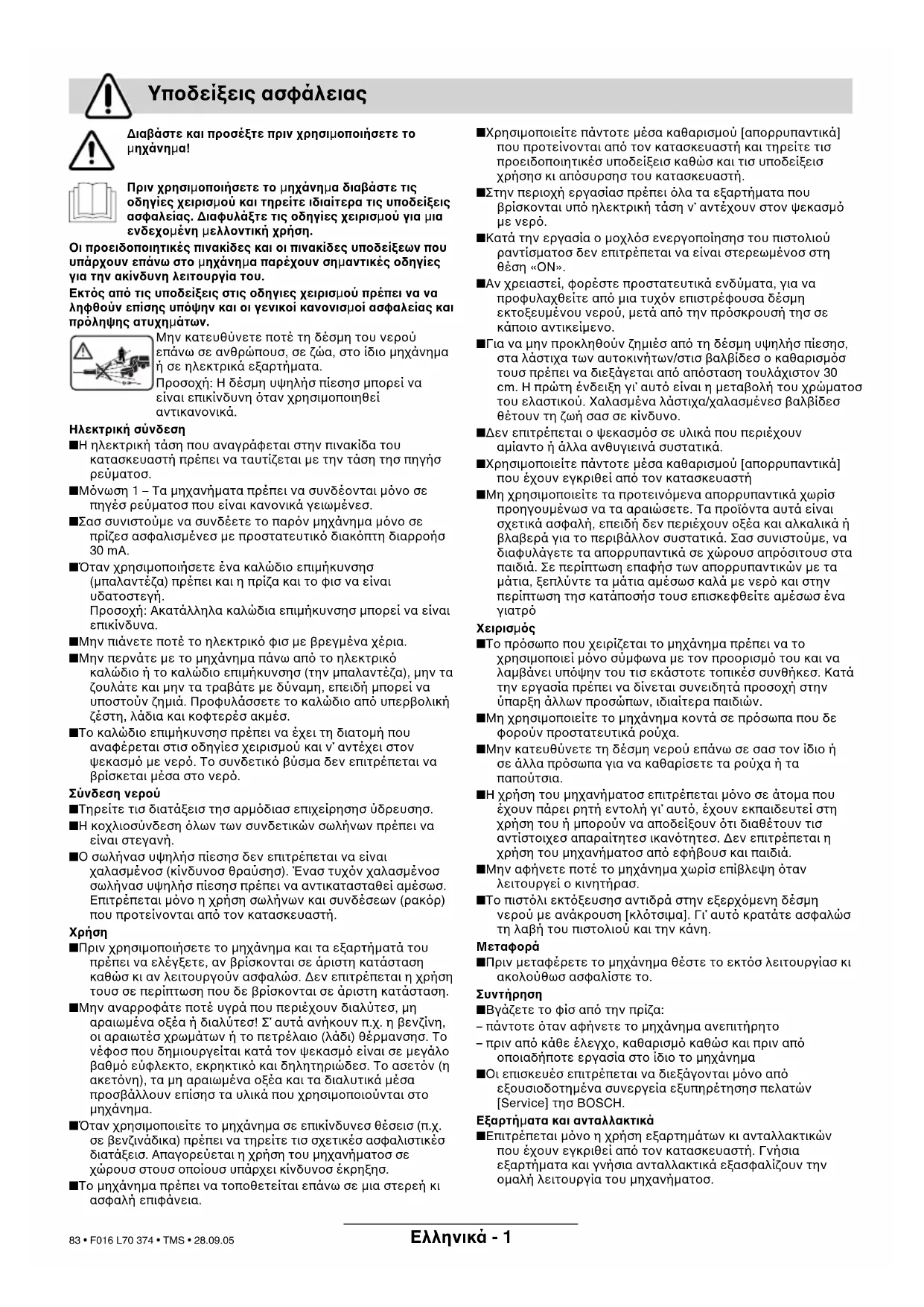 Η αντλία δεν είναι στεγανή Επιτρέπονται 6 σταγ$νες το λεπτ$. Σε περίπτωση σηµαντικής, αντικανονικής διαρροής απευθυνθείτε στο εξουσιοδοτηµένο κατάστηµα Service της Bosch. F016 L70 374 - book Seite 6 Mittwoch, 19. Oktober 2005 2:20 14 88 • F016 L70 374 • TMS • 28.09.05Eλληνικά - 7 Χηµικέσ ουσίεσ που επιβαρύνουν το περιβάλλον δεν επιτρέπεται να καταλήγουν στο έδαφοσ, στα υπγεια νερά, στισ λίµνεσ, στα ποτάµια κτλ. `Οταν χρησιµοποιείτε απορρυπαντικά τηρείτε αυστηρά τισ οδηγίεσ που υπάρχουν επάνω στη συσκευασία καθώσ και την προβλεπµενη αναλογία µείξησ. ταν καθαρίζετε κινητήρεσ οχηµάτων τηρείτε τισ εκάστοτε τοπικέσ διατάξεισ: Πρέπει ν΄ αποφευχθεί ή κατάληξη των ξεπλυµένων λαδιών στα υπγεια νερά. Τα ηλεκτρικά εργαλεία, τα εξαρτήµατα και οι συσκευασίεσ πρέπει να ανακυκλώνονται µε τρπο φιλικ προσ το περιβάλλον. Μ'νο για χώρες της EΕ: Μη ρίχνετε τα ηλεκτρικά εργαλεία στα απορρίµµατα του σπιτιού σασ! Σύµφωνα µε την Κοινοτική Οδηγία 2002/96/EΚ σχετικά µε τισ παλαιέσ ηλεκτρικέσ και ηλεκτρονικέσ συσκευέσ και την µεταφορά τησ σε εθνικ δίκαιο, τα άχρηστα ηλεκτρικά εργαλεία δεν είναι υποχρεωτικ πλέον να συλλέγονται ξεχωριστά πριν να ανακυκλωθούν µε τρπο φιλικ προσ το περιβάλλον. Αναλυτικά σχέδια και πληροφορίες για ανταλλακτικά θα βρείτε στην ηλεκτρονική