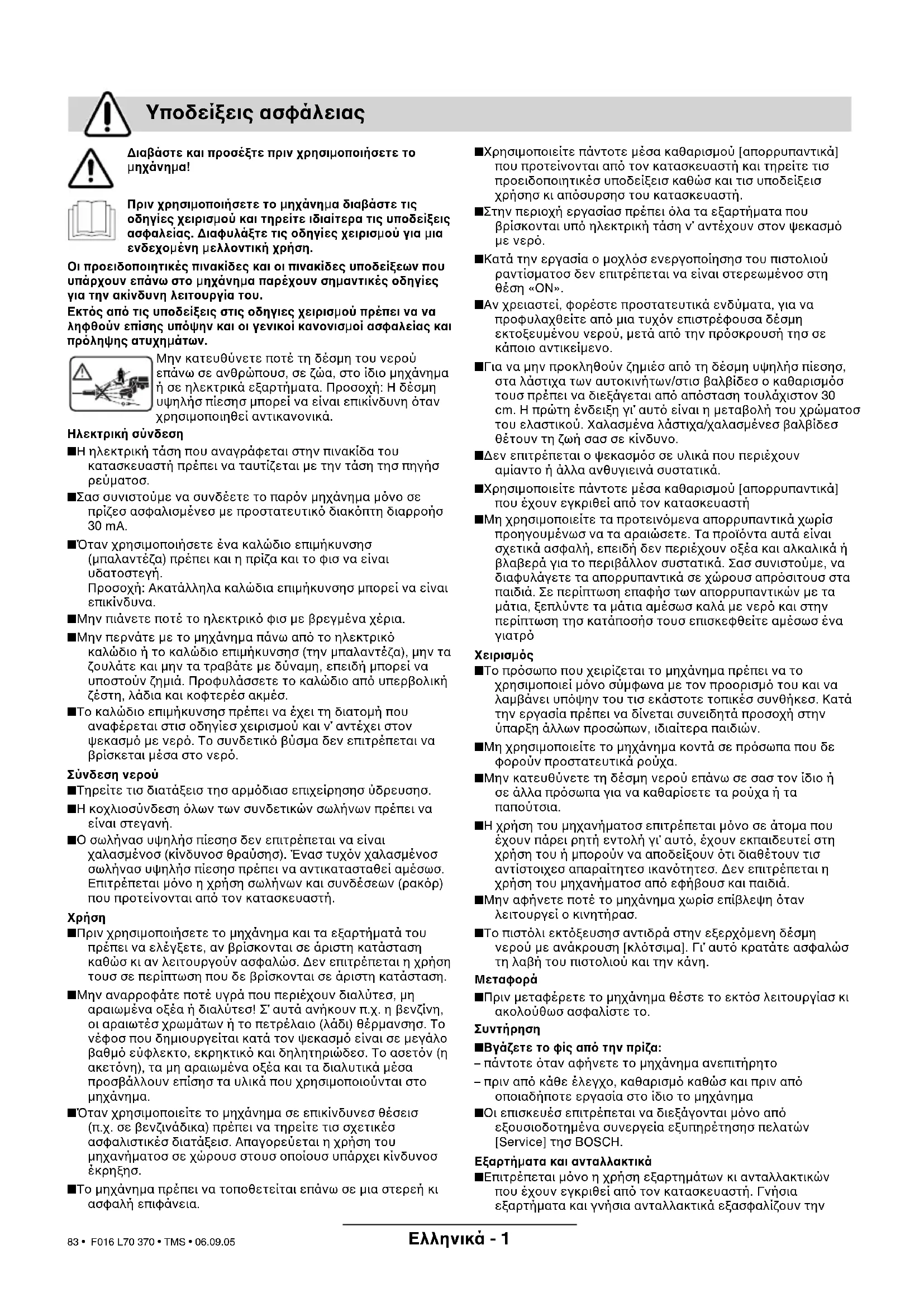Πριν χρησιµοποιήσετε το µηχάνηµα διαβάστε τις οδηγίες χειρισµού και τηρείτε ιδιαίτερα τις υποδείξεις ασφαλείας. ∆ιαφυλάξτε τις οδηγίες χειρισµού για µια ενδεχοµένη µελλοντική χρήση. Οι προειδοποιητικές πινακίδες και οι πινακίδες υποδείξεων που υπάρχουν επάνω στο µηχάνηµα παρέχουν σηµαντικές οδηγίες για την ακίνδυνη λειτουργία του. Εκτ'ς απ' τις υποδείξεις στις οδηγιες χειρισµού πρέπει να να ληφθούν επίσης υπ'ψην και οι γενικοί κανονισµοί ασφαλείας και πρ'ληψης ατυχηµάτων. Μην κατευθύνετε ποτέ τη δέσµη του νερού επάνω σε ανθρώπουσ, σε ζώα, στο ίδιο µηχάνηµα ή σε ηλεκτρικά εξαρτήµατα. Προσοχή: Η δέσµη υψηλήσ πίεσησ µπορεί να είναι επικίνδυνη ταν χρησιµοποιηθεί αντικανονικά. Ηλεκτρική σύνδεση ■ Η ηλεκτρική τάση που αναγράφεται στην πινακίδα του κατασκευαστή πρέπει να ταυτίζεται µε την τάση τησ πηγήσ