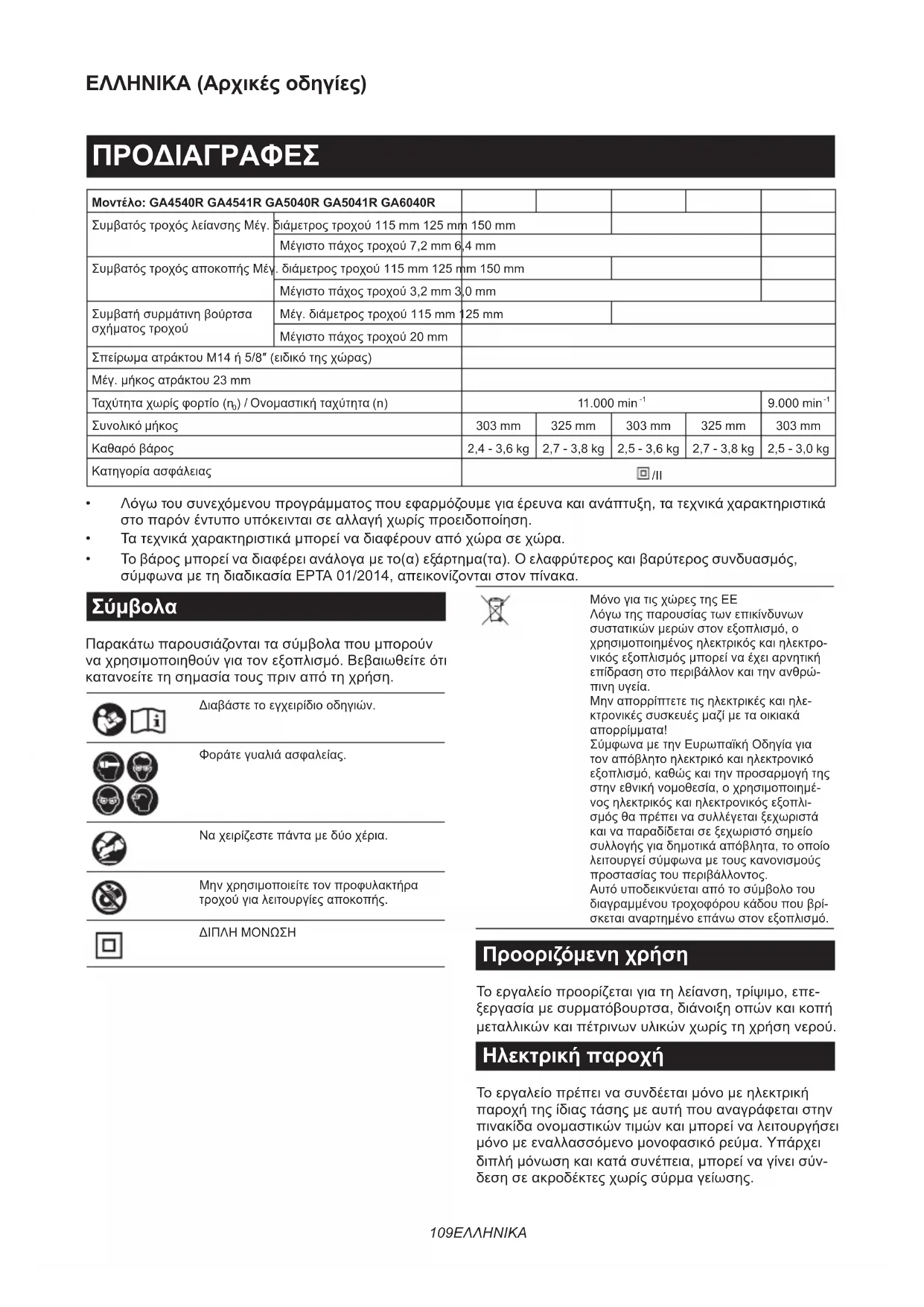 BEMÆRK: Nogle ting på denne liste kan være inklu- deret i værktøjspakken som standardtilbehør. Det kan være forskellige fra land til land.109 ΕΛΛΗΝΙΚΑ ΕΛΛΗΝΙΚΑ (Αρχικές οδηγίες) ΠΡΟΔΙΑΓΡΑΦΕΣ Μοντέλο: GA4540R GA4541R GA5040R GA5041R GA6040R Συμβατός τροχός λείανσης Μέγ. διάμετρος τροχού 115 mm 125 mm 150 mm Μέγιστο πάχος τροχού 7,2 mm 6,4 mm Συμβατός τροχός αποκοπής Μέγ. διάμετρος τροχού 115 mm 125 mm 150 mm Μέγιστο πάχος τροχού 3,2 mm 3,0 mm Συμβατή συρμάτινη βούρτσα σχήματος τροχού Μέγ. διάμετρος τροχού 115 mm 125 mm Μέγιστο πάχος τροχού 20 mm Σπείρωμα ατράκτου M14 ή 5/8″ (ειδικό της χώρας) Μέγ. μήκος ατράκτου 23 mm Ταχύτητα χωρίς φορτίο (n