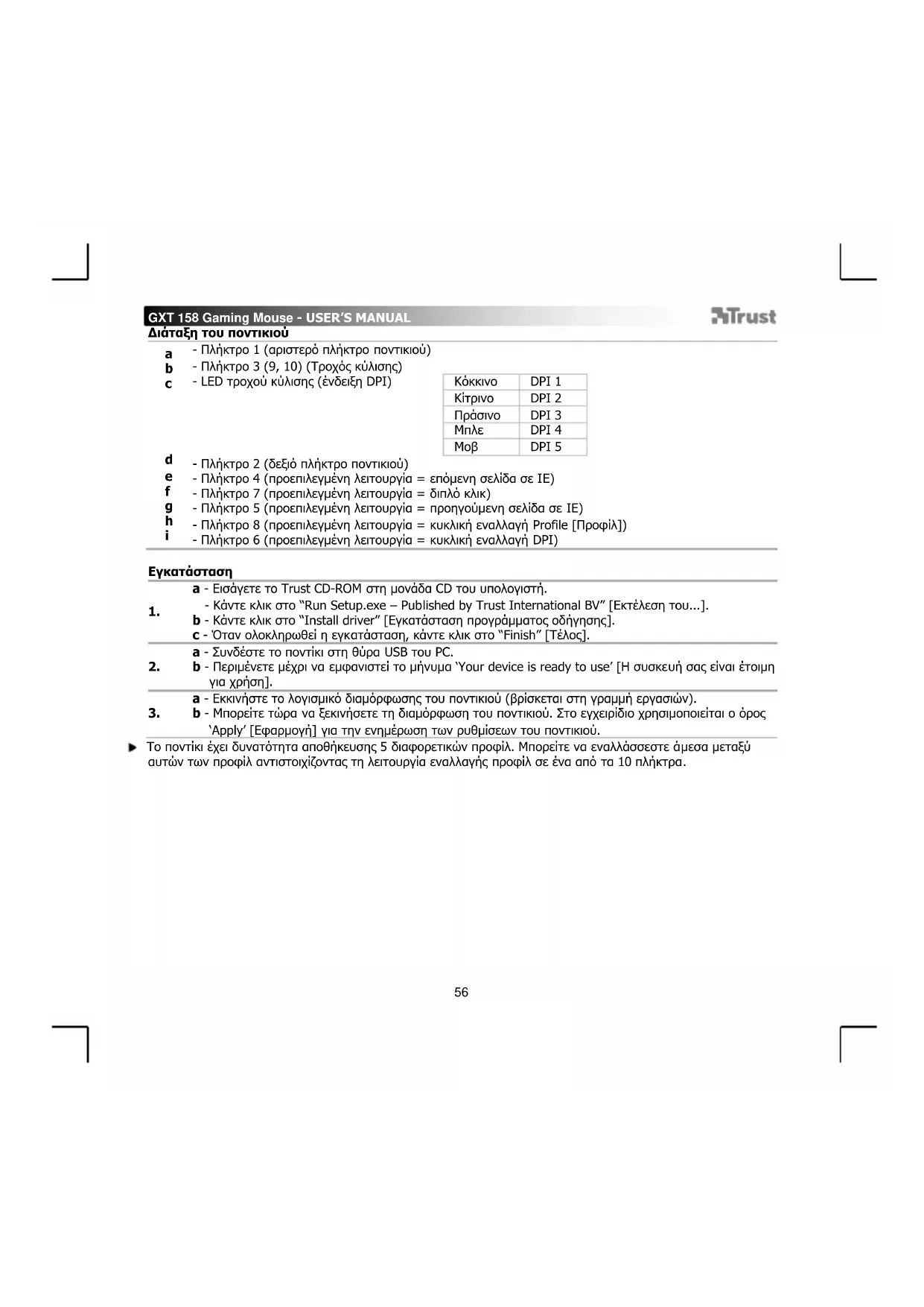 a - Εισάγετε το Trust CD-ROM στη μονάδα CD του υπολογιστή. - Κάντε κλικ στο “Run Setup.exe – Published by Trust International BV” [Εκτέλεση του...]. b - Κάντε κλικ στο “Install driver” [Εγκατάσταση προγράμματος οδήγησης]. c - Όταν ολοκληρωθεί η εγκατάσταση, κάντε κλικ στο “Finish” [Τέλος].